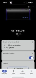 Was auffällt: Bei beiden Features gibt es einige Bedieninkonsistenzen. So kann man aus DJ Control den Equalizer zwar verstellen, aber dann im originären EQ-Bereich nicht zurücksetzen. Die Beleuchtung lässt sich zwar unter Party Light zurücksetzen, aber ganz abschalten oder die Grundmodi ändern kann man nur im Bereich Geräteeinstellung/System/Beleuchtungsmodus oder auf der Geräterückseite. Trotzdem sind das zwei nette Features, um mit dem Sony ULT FIELD 5 noch mehr Partyunterhaltung zu erzeugen.