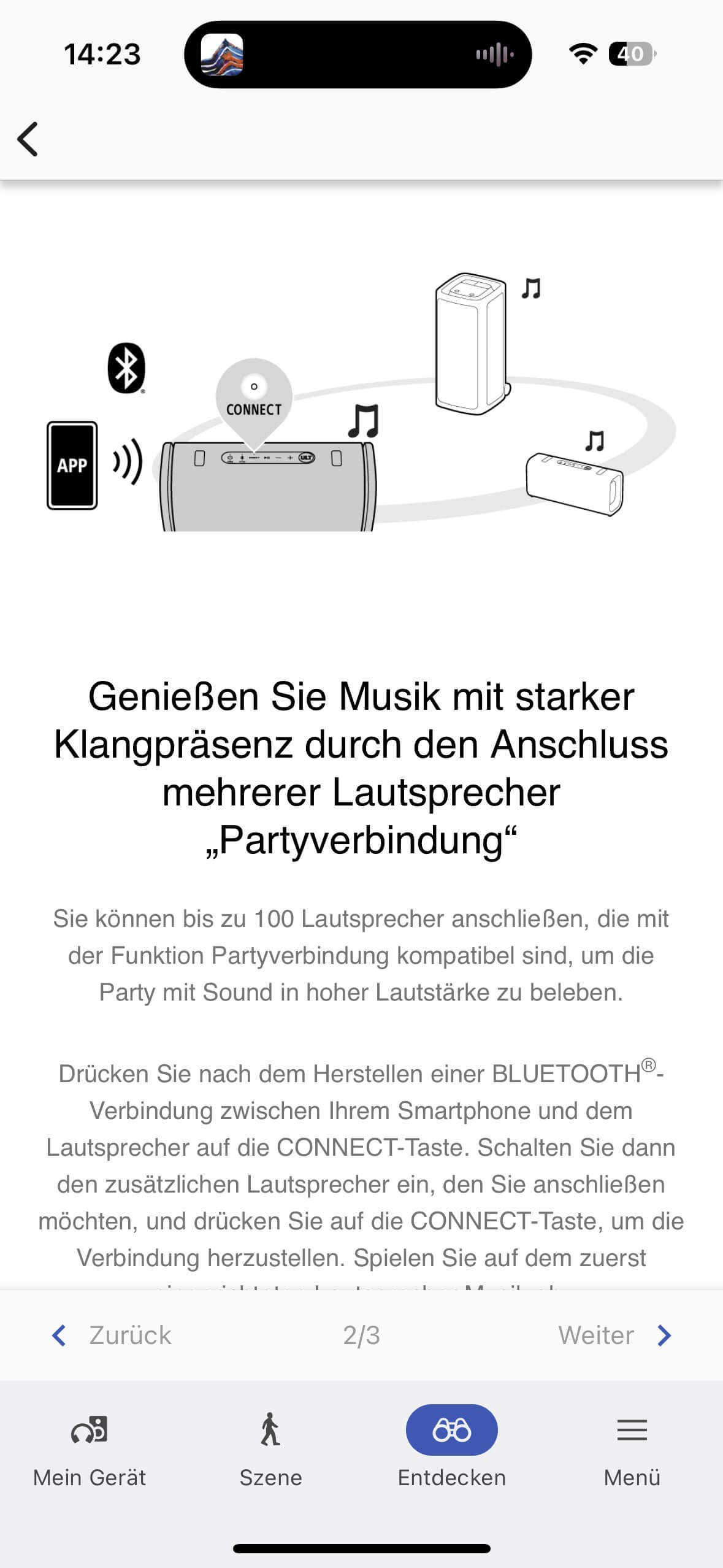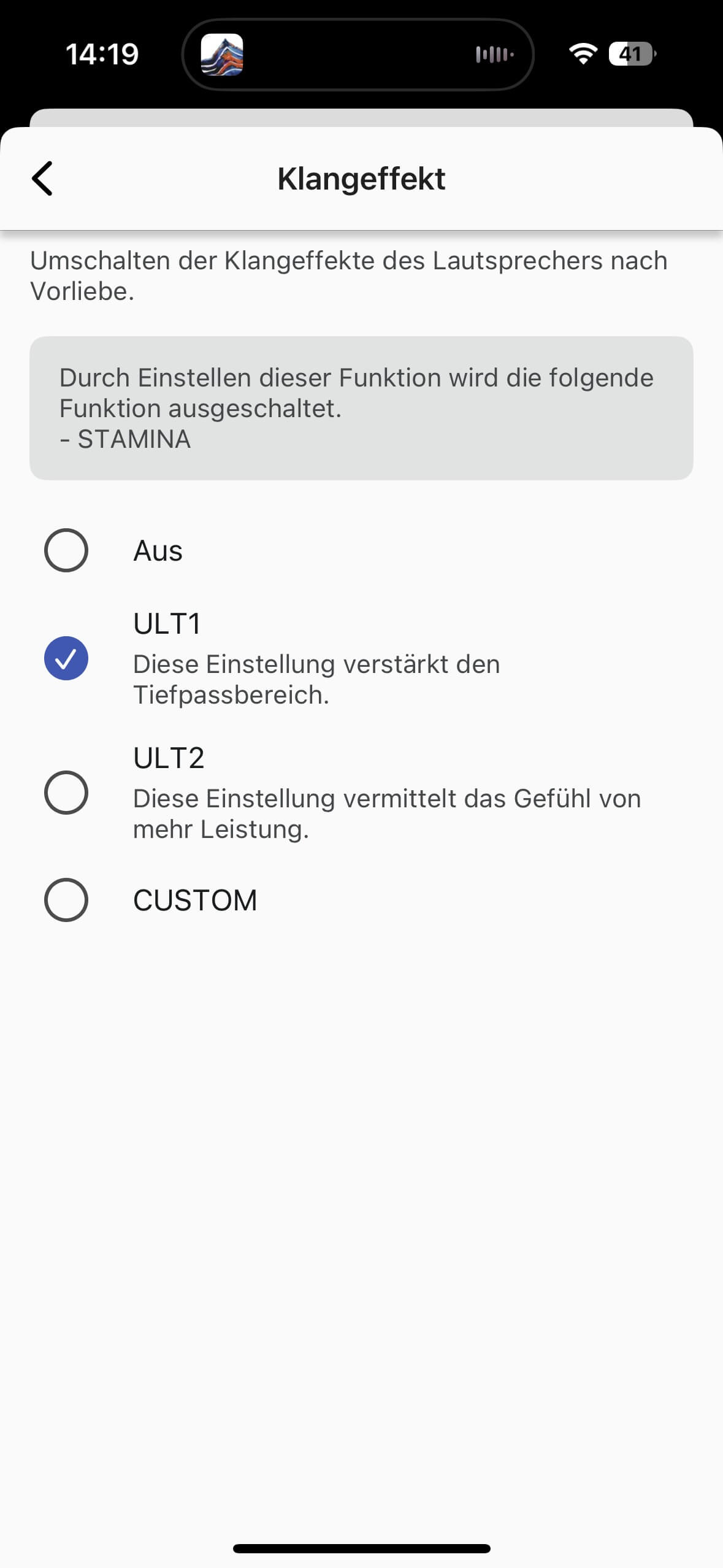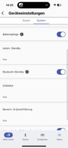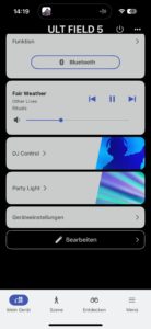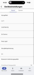 Mit der App „Sound Connect“ bekommt ihr direkten Zugriff auf einen 10-Band-Equalizer und zwei bassverstärkenden Presets, um den Klang zu optimieren. Die App gibt Überblick zu Ladestand und verwendeten Codec, die Multipointverbindungen, kann die Eingänge schalten, Updates verwalten und Spezialitäten wie Klangfeldoptimierung (eine Art Klanganpassung in Abhängigkeit der Umgebungslautstärke), Verbindungsqualität und Stamina (eine Energiesparfunktion) schalten. Mit den Feldern „DJ Control“ und „Party Light“ beginnt der Spaß. DJ Control ermöglicht es, Effekte und Sampling-Sounds über einen Touchbereich in die laufende Musik zu feuern und so mit Scratching, Hupen und Jubeln die Party anzuheizen.