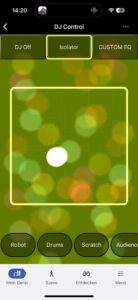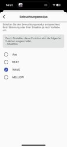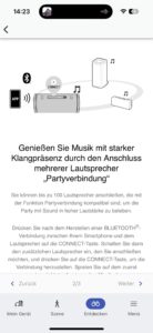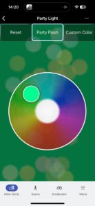 Bei Party Light kann man die ansonsten automatisch ablaufende Lightshow selbst beeinflussen und dabei auch seine Lieblingsfarbe auswählen, was – ehrlich gesagt – nach mehr klingt, als es ist. Da die Beleuchtung insgesamt eher verdeckt in der Box eingelassen ist und dabei recht unauffällig flackert, wabert oder blitzt, ist es mit der manuellen Eingabe auch nicht weit her. Man muss schon genau hinsehen, was sich über die Touchfeldeingabe großartig verändert.