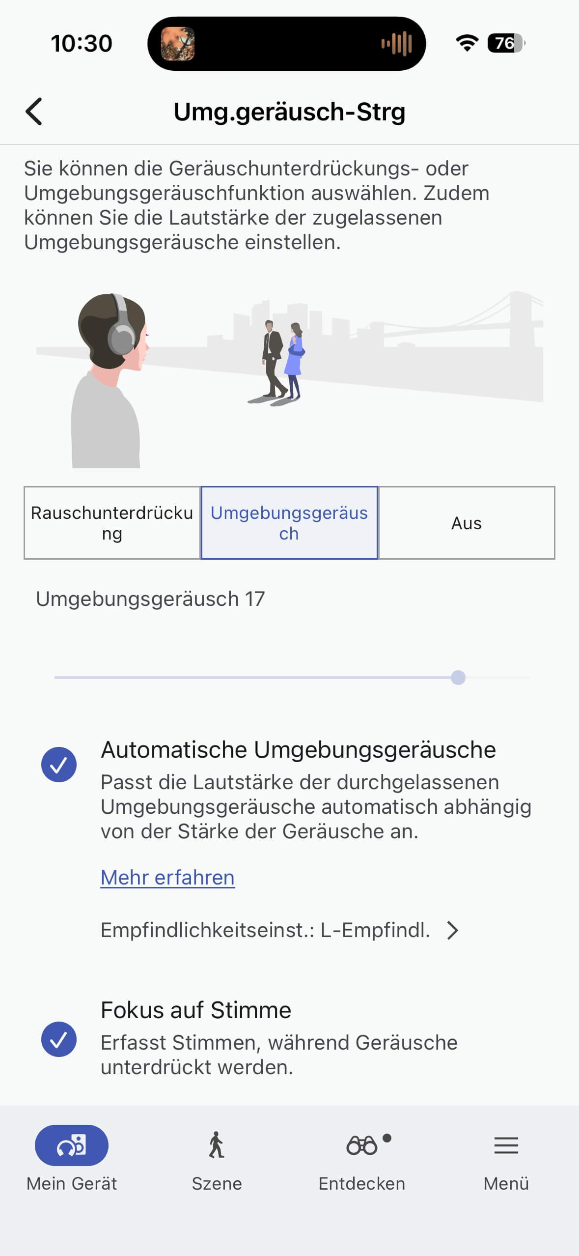 Ich finde den Transparenzmodus sehr gut – er klingt natürlich, rauscharm und überhaupt nicht technisch. In der Maximaleinstellung sind die Höhen leicht überbetont, was kein Dealbreaker ist. Der Stimmenfokus-Modus schafft einen guten Kompromiss zwischen Offenheit und Abschirmung und hilft, um zum Beispiel Durchsagen besser hören zu können.