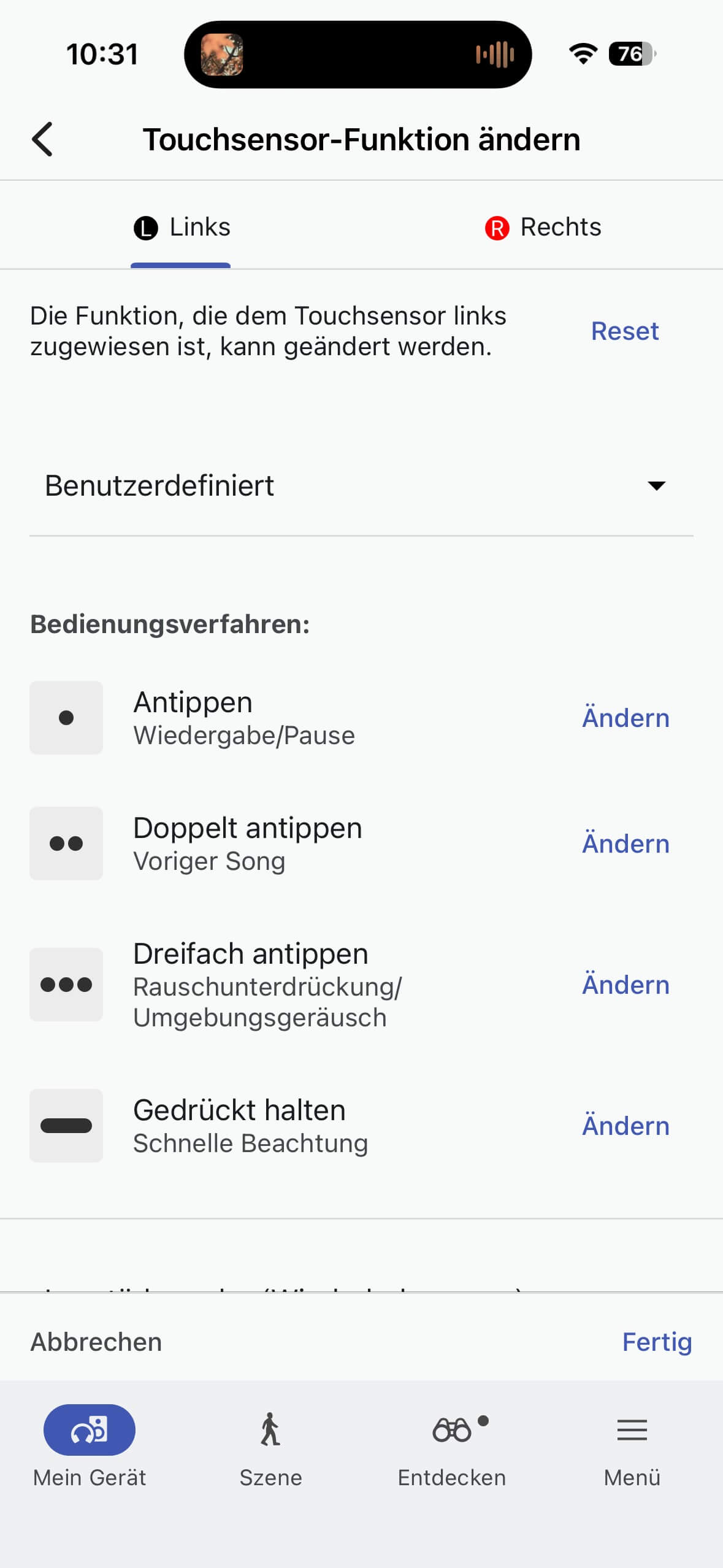Neu in der App: Die Gesten lassen sich komplett frei belegen – nicht mehr nur blockweise. Das ist eine echte Verbesserung. Besonders gut: Die Lautstärke per Dauertippen regulieren (links runter, rechts rauf). Klingt seltsam, funktioniert aber hervorragend.