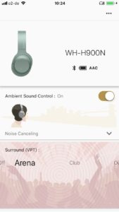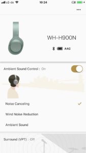 Die aktive Rauschunterdrückung im WH-H900N ist zuschaltbar. Um schnell auf Situationen reagieren zu können, in denen Außengeräusche eine größere Rolle spielen, etwa zu Fuß auf der Straße, lässt sich auf die Variante „Ambient-Sound“ umschalten, die bestimmte Frequenzen eindringen lässt und damit Sprache und andere mittelfrequente Geräusche wieder besser hörbar macht. Dazu gibt es die praktische Möglichkeit das Noise Cancelling temporär zu deaktivieren, indem man die Hand über die rechte Ohrmuschel hält.