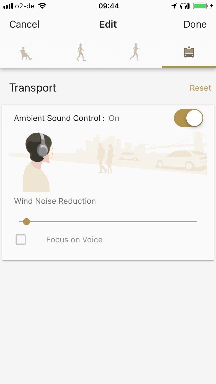 Das Noise Cancelling packt bei Bedarf gut zu, rauscht aber ein wenig. Es setzt einen guten Sitz der Ohrstöpsel voraus, kommt aber dennoch nicht auf die volle Leistung guter Over-Ear-Produkte wie dem WH-1000XM2. Neben einer mittelkräftigen Abschirmung, die bei voller Intensität insbesondere im tieffrequenten Bereich greift, kann der Kopfhörer per Luftdruckmessung auch die Umgebung analysieren. Nach einer etwas trägen Analysephase schaltet er automatisch zwischen vier Modi um, die Umgebungsgeräusche in unterschiedlicher Intensität passieren lassen. Gleichzeitig ist das „Einsprechen“ von Umgebungsgeräuschen manuell regel- und zusätzlich per schaltbarem Filter auf ein Sprachband begrenzbar. Zusammenfassend lässt sich das Noise Cancelling als variabel beschreiben – von angenehmer und effektiv umgesetzter Stille bei der Zugfahrt bis hin zu dezenteren Effekten, etwa beim Spazieren entlang der Straße. Nicht vorgesehen hingegen ist ein schnelles Deaktivieren des Noise Cancellings für temporäre Kommunikation.