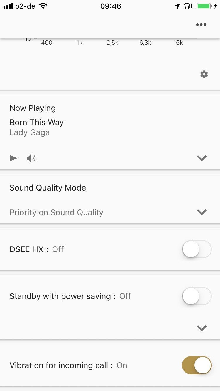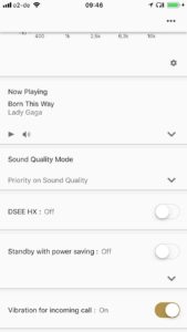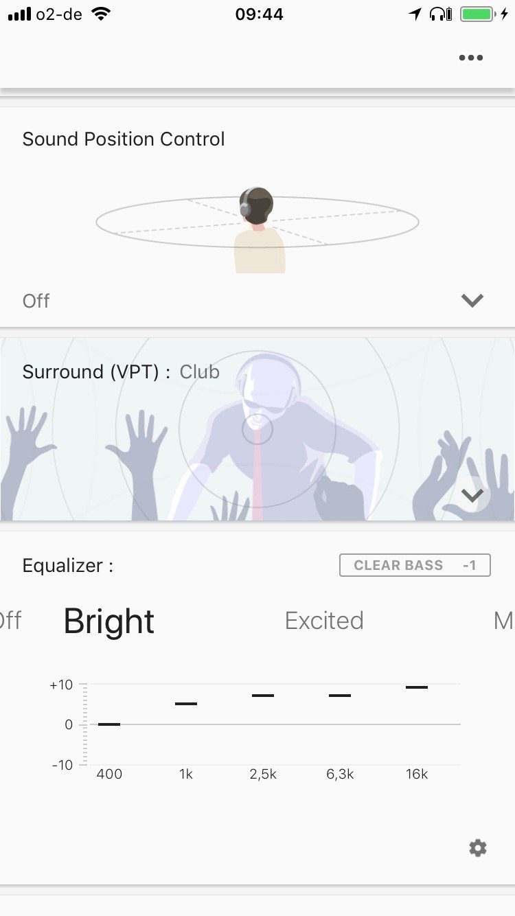 Zu den Extras: Der Sinn für die mögliche freie Klangplatzierung um den Kopf (Sound Position Control) oder die zuschaltbare Simulation von vier Räumen erschließt sich mir offengesagt nicht. Es handelt sich in beiden Fällen eher um Effekthaschereien, die sich negativ auf das Klangergebnis auswirken. Auch die Klangverbesserung (DSEE HX) bei komprimiertem Quellmaterial kann ich nicht wirklich nachvollziehen. Immerhin funktioniert diese Option im Unterschied zu manch anderem Sony-Modell ohne Lautstärkesprung – eine Verbesserung kann ich aber im Blindtest nicht bestätigen.