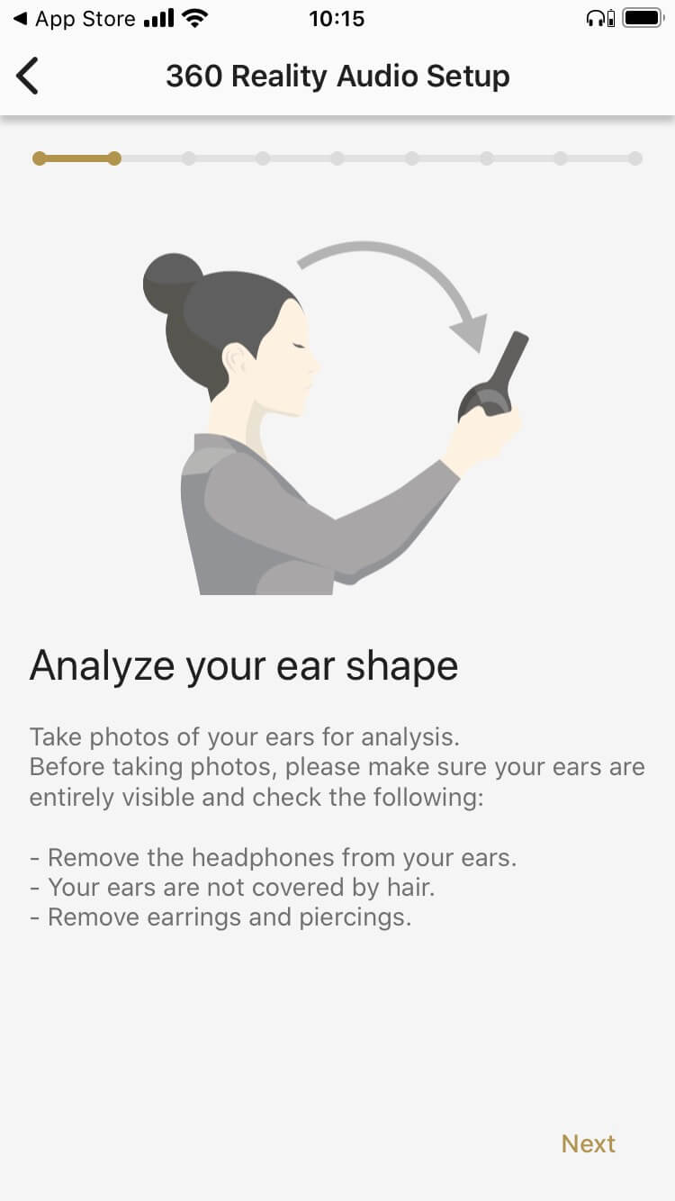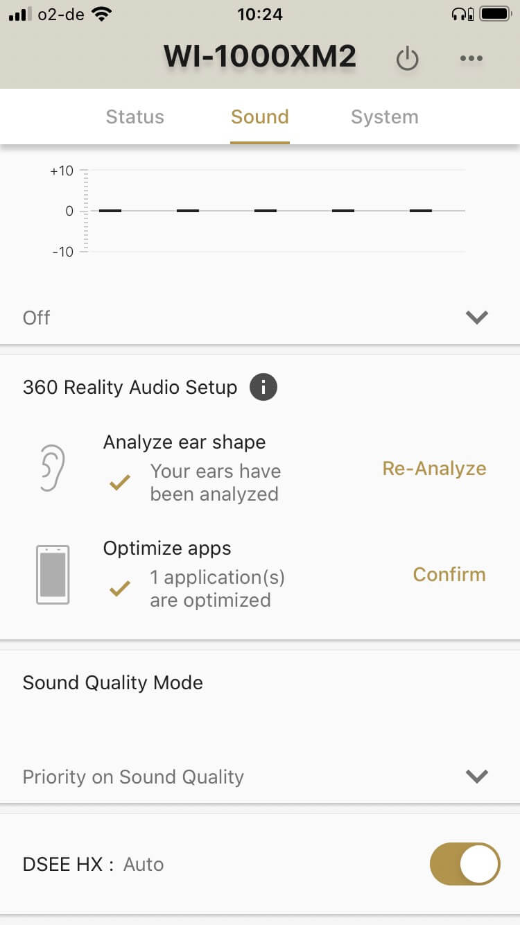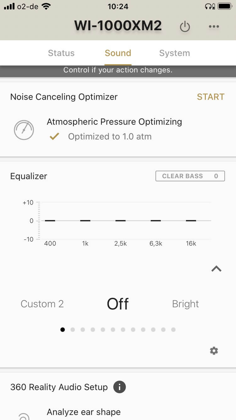 Für die Konfiguration ist die kostenlose iOS/Google-App „Headphones Connect“ zuständig. Hier lassen sich beispielsweise die Sprachansagen und das automatische Ausschalten des Kopfhörers bei Inaktivität konfigurieren, aber auch das Noise Cancelling und die üppige Klangregelung. Der Equalizer bietet fünf Bänder, einen separat regelbaren Bassbereich sowie speicherbare Einstellungen. Bemerkenswert ist weiter die Unterstützung von 360 Reality Audio. Um mit entsprechend kodierten Audiodateien einen echten Raumklangeindruck zu erhalten, wird die Ohrform fotografisch analysiert. Die unterstützten Anbieter für entsprechende Dateien sind derzeit 360 by Deezer, nugs.net und Tidal.