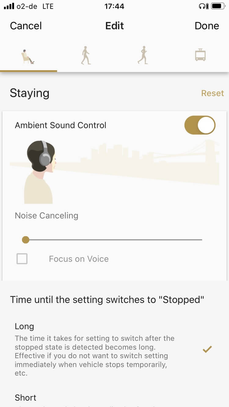 Mithilfe der Option „Adaptive Sound Control“ kann der Kopfhörer den Grad der Rauschminderung anhand des Bewegungsprofils ermitteln und automatisch zwischen vier unterschiedlich intensiven Modi umschalten. Das kennt man bereits vom Vorgänger. Neu ist jedoch die Möglichkeit, das Profil auch auf der Basis von gespeicherten Geodaten zu wechseln.