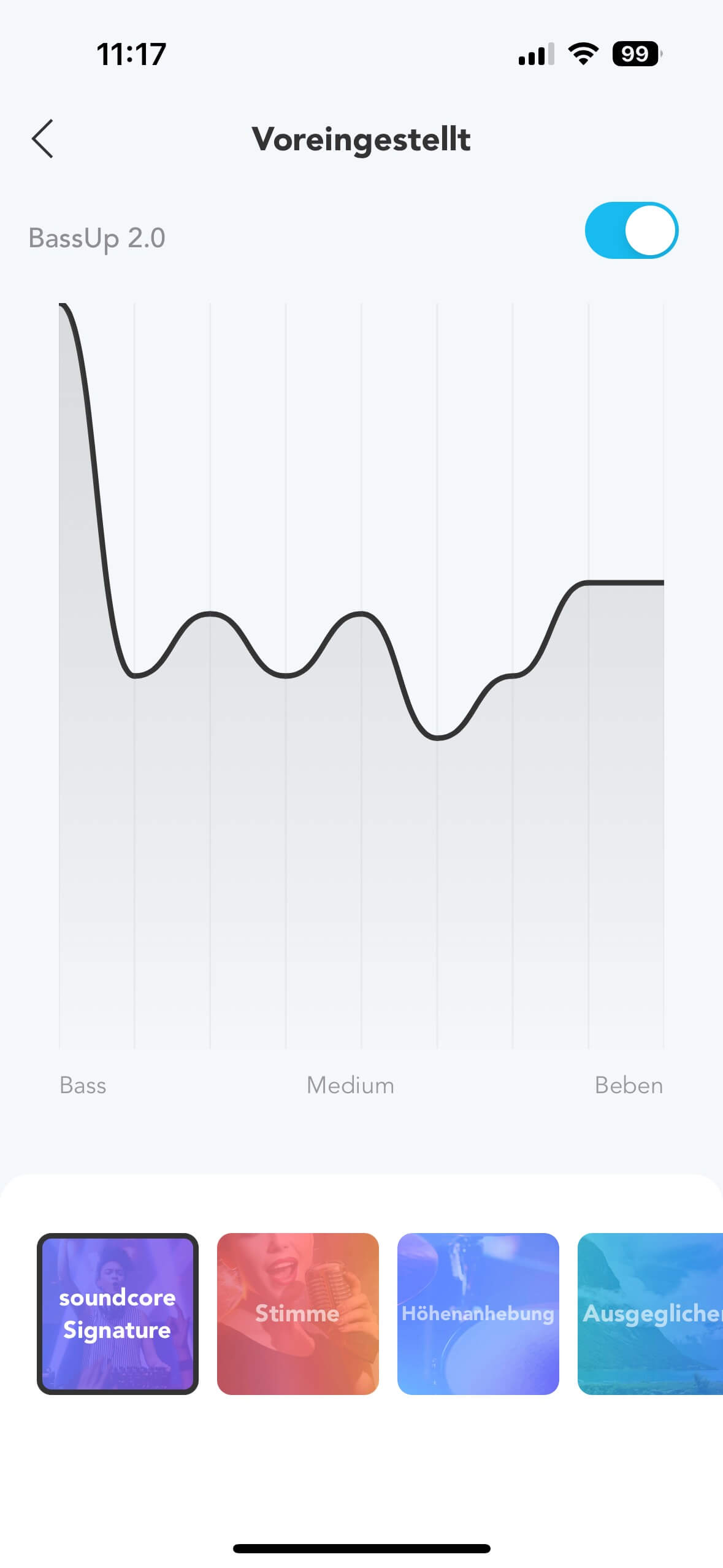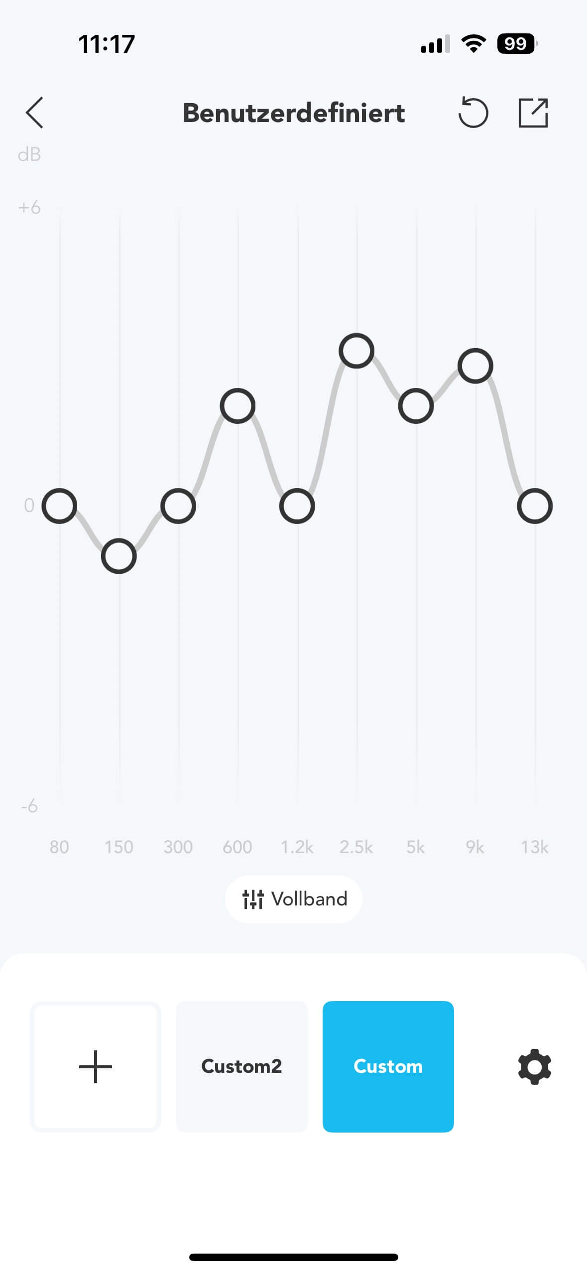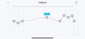 Der Equalizer bietet neben den vier Klangprofilen („Signature“, „Stimme“, „Höhenanhebung“ und „Ausgeglichen“) auch die Möglichkeit eigene Profile über neun Bänder zu erstellen und abzuspeichern.