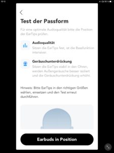 Ab Werk ist die Wiedergabe steuerbar, kann vor- sowie zurückgesprungen werden und es lassen sich Telefonate über die Hörer abwickeln. Zudem ist ein Umschalten zwischen ANC- und Umgebungsmodus möglich, was über die App um den Standardbetrieb ergänzt werden kann. Darüber hinaus lassen sich bei Bedarf eine Lautstärkeregelung und der Sprachassistent nachrüsten. Ergänzend zur Drucksteuerung sind die In-Ears noch mit einer Trageerkennung ausgestattet, die deaktivierbar ist und deren Zuverlässigkeit durch eine Kalibrierung erhöht werden kann.