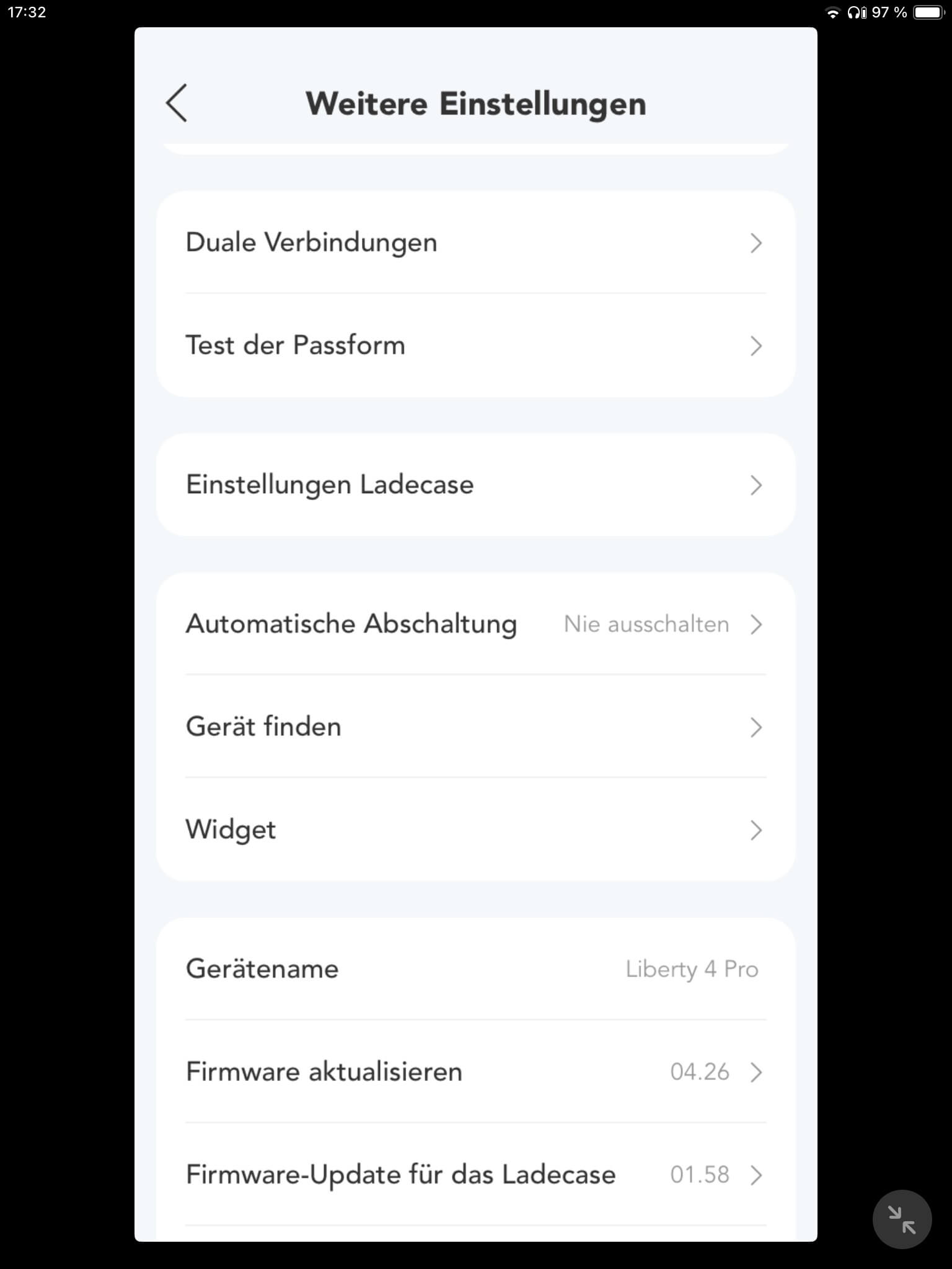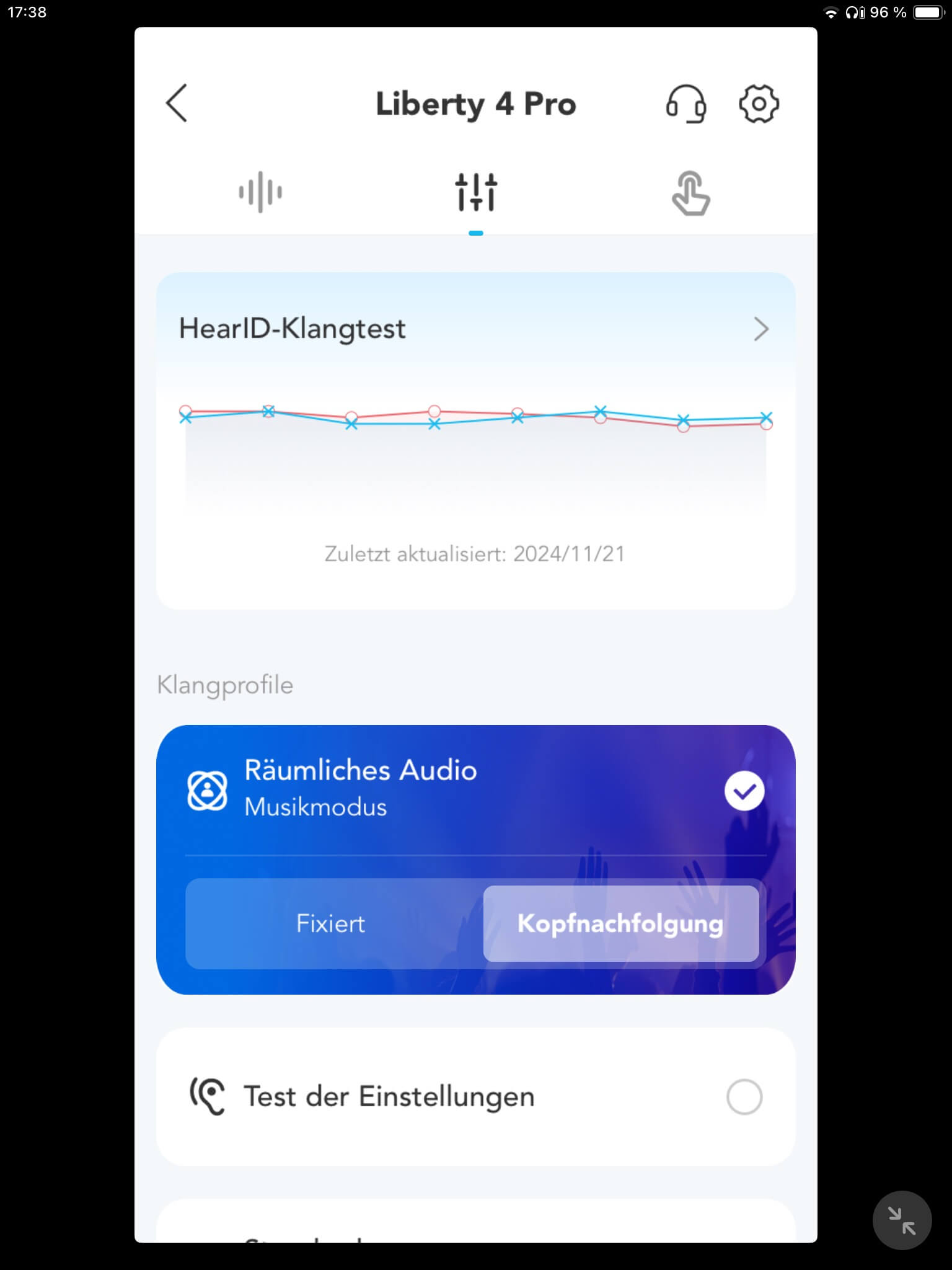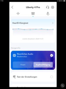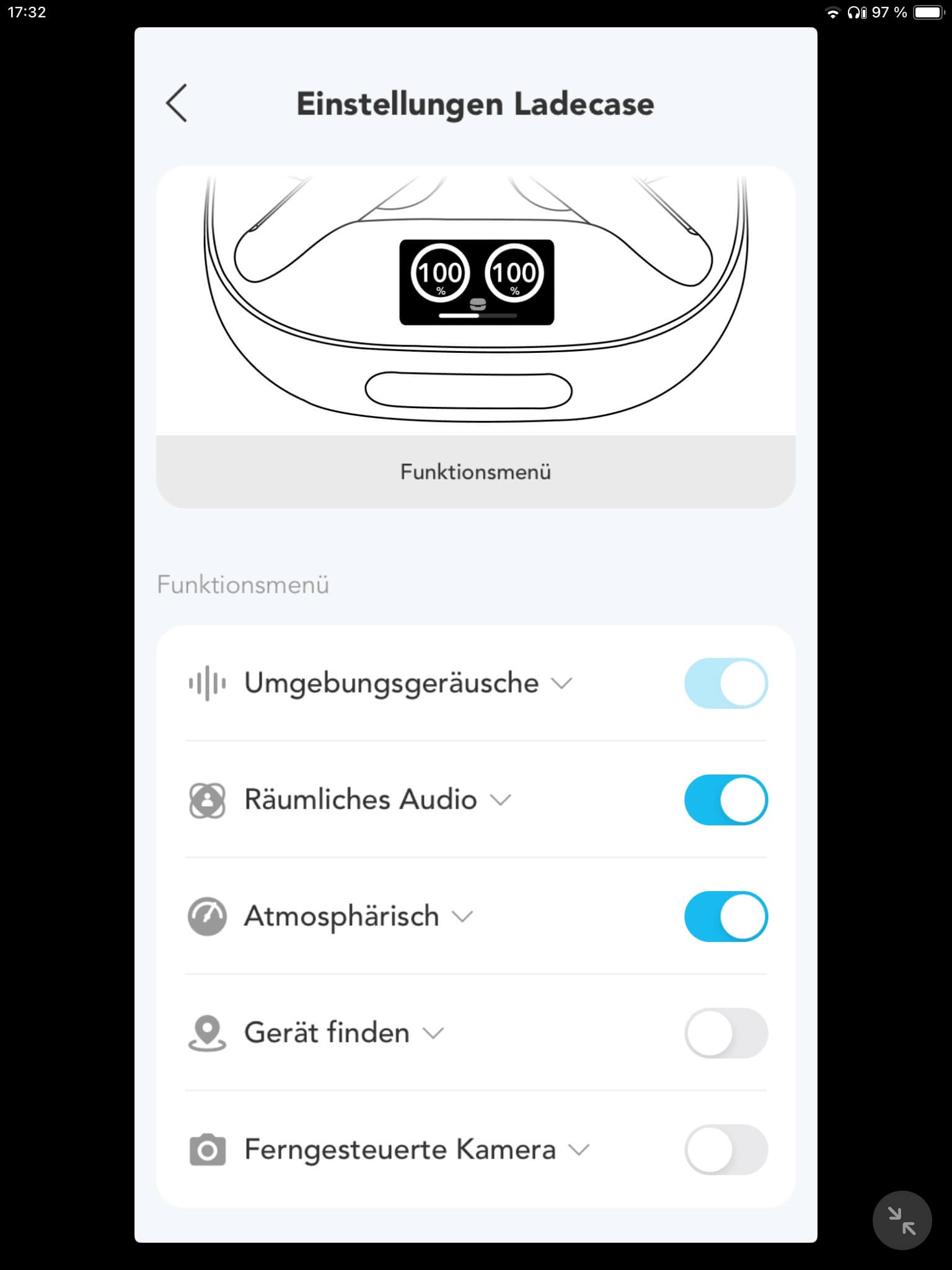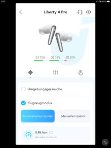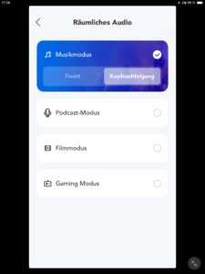Zur Auswahl stehen darüber hinaus eine Luftdruckanzeige, eine Fernsteuerungsoption für die Handy-Kamera und eine Suchfunktion, die per Piepton beim Auffinden der Hörer behilflich sein kann. Auch das gesamte Repertoire an räumlichen Klangmodi mit und ohne Head-Tracking (siehe unten) ist über das Case aufrufbar, wodurch beim Serien- und Filmeschauen auf dem Tablet nicht zur App gewechselt werden muss oder sich Bildschirmzeit beim Smartphone einsparen lässt.