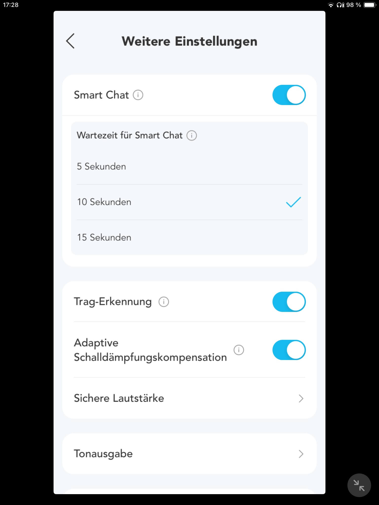 Neben den vielseitigen Steuerungsmöglichkeiten lässt sich über die App eine Smart Chat-Funktion einrichten, die im ANC-Modus ein spontanes Kommunizieren ermöglicht, indem beim Sprechen die Wiedergabelautstärke deutlich abgesenkt und automatisch in den Transparenzmodus gewechselt wird. Eine adaptive Klangkompensation soll hingegen eine konstante Wiedergabequalität gewährleisten, indem Klangverluste ausgeglichen werden. Ein sicheres Hören lässt sich zudem durch den Gehörschutz umsetzen, wobei die Limitierung der Maximallautstärke einstellbar ist und eine informative Dezibel-Skala hilfreich bei der Auswahl unterstützen kann. Klasse! Des Weiteren gehören noch ein Passform-Test und Timer sowie Firmware-Aktualisierungen für Hörer und Case zum Funktionsumfang. Zumal sich auf Android-Geräten der LDAC-Codec aktivieren lässt, was aber ein Firmware-Update voraussetzt.