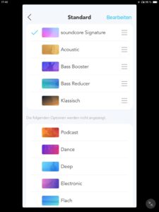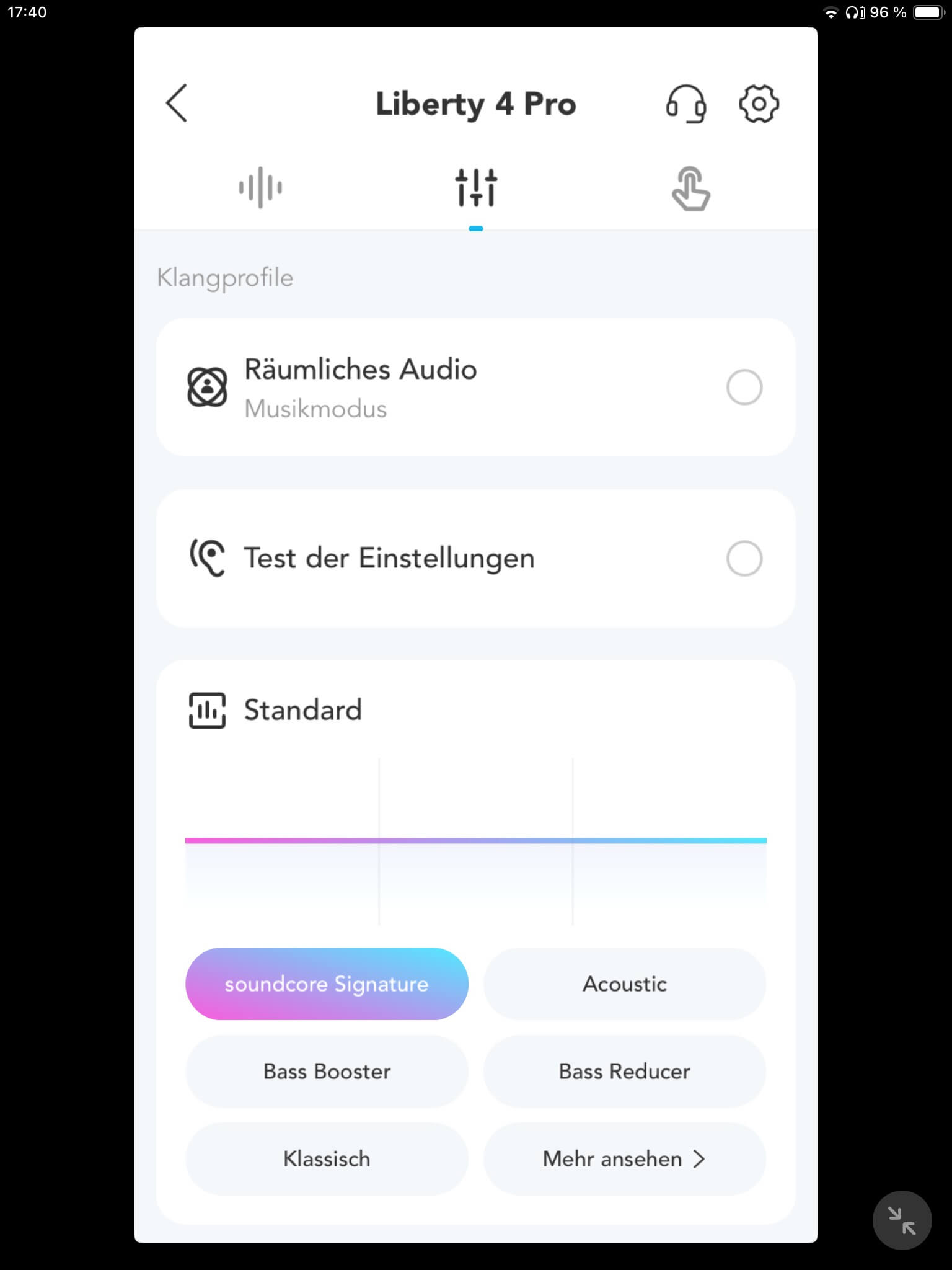 Die Klangregelung der Soundcore Liberty 4 Pro umfasst eine EQ-Sektion mit acht Bändern, um eigene Anpassungen vornehmen zu können, die sich als Presets speichern lassen. Darüber hinaus stehen 22 vorkonfigurierte EQ-Settings zur Auswahl, die auch als Ausgangsbasis für eigene Einstellungen genutzt werden können, was gut umgesetzt ist. Eine weitere Option stellt der Hear ID-Klangtest dar, wobei zunächst das Hörvermögen pro Ohr erfasst wird. Im Anschluss erfolgt eine Abfrage von Hörpräferenzen anhand eines A/B-Vergleichs, um eine individuelle EQ-Kurve anzulegen. Dieser Part kann jedoch durch eigene Anpassungen oder eins der zur Verfügung gestellten EQ-Settings ersetzt werden, wodurch eine hohe Flexibilität besteht.