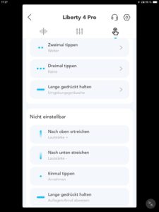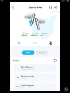 Ab Werk ermöglicht die Stielsteuerung der Soundcore Liberty 4 Pro ein Starten und Stoppen der Wiedergabe, das Abwickeln von Telefonaten, ein Vor- oder Zurückspringen zur Titelauswahl und eine Lautstärkeregelung. Darüber hinaus kann zwischen ANC- und Transparenzmodus umgeschaltet werden, was sich per App um den Standardbetrieb erweitern lässt. Auch der Sprachassistent kann nachgerüstet werden. Bei den Konfigurationsmöglichkeiten ist Wischen der Lautstärkeregelung vorbehalten, während sich das ein- bis dreimalige Zusammendrücken anpassen lässt. Ein manuelles Ein- und Ausschalten über den druck- und berührungsempfindlichen Steuerungsbereich ist allerdings nicht vorgesehen, wohingegen eine einseitige Nutzung der In-Ears im Single-Betrieb unterstützt wird. Ergänzend steht noch eine Trageerkennung zur Verfügung, die nach Bedarf (de-)aktivierbar ist, aber nicht wie bei den Liberty 4 kalibriert werden kann.