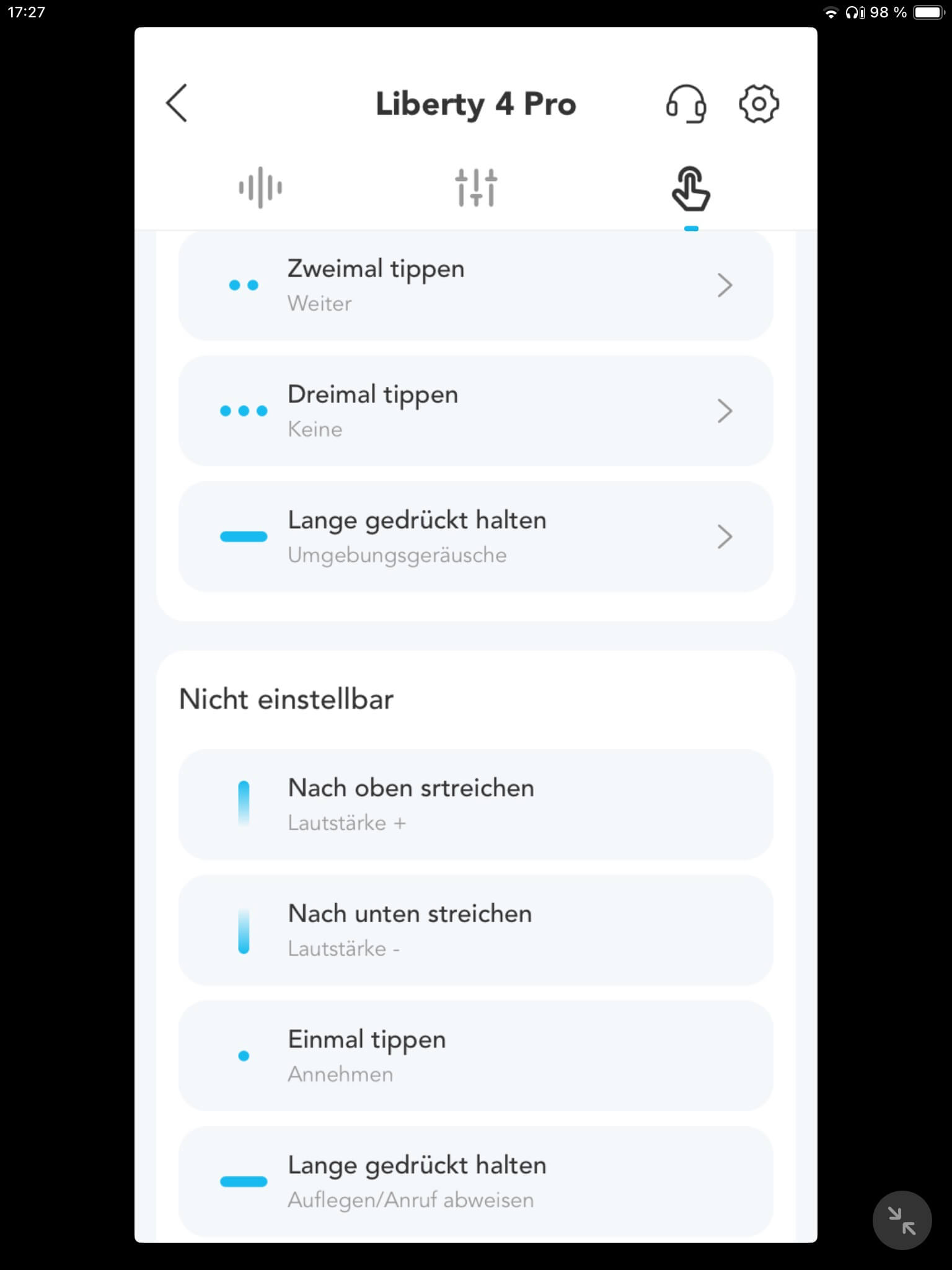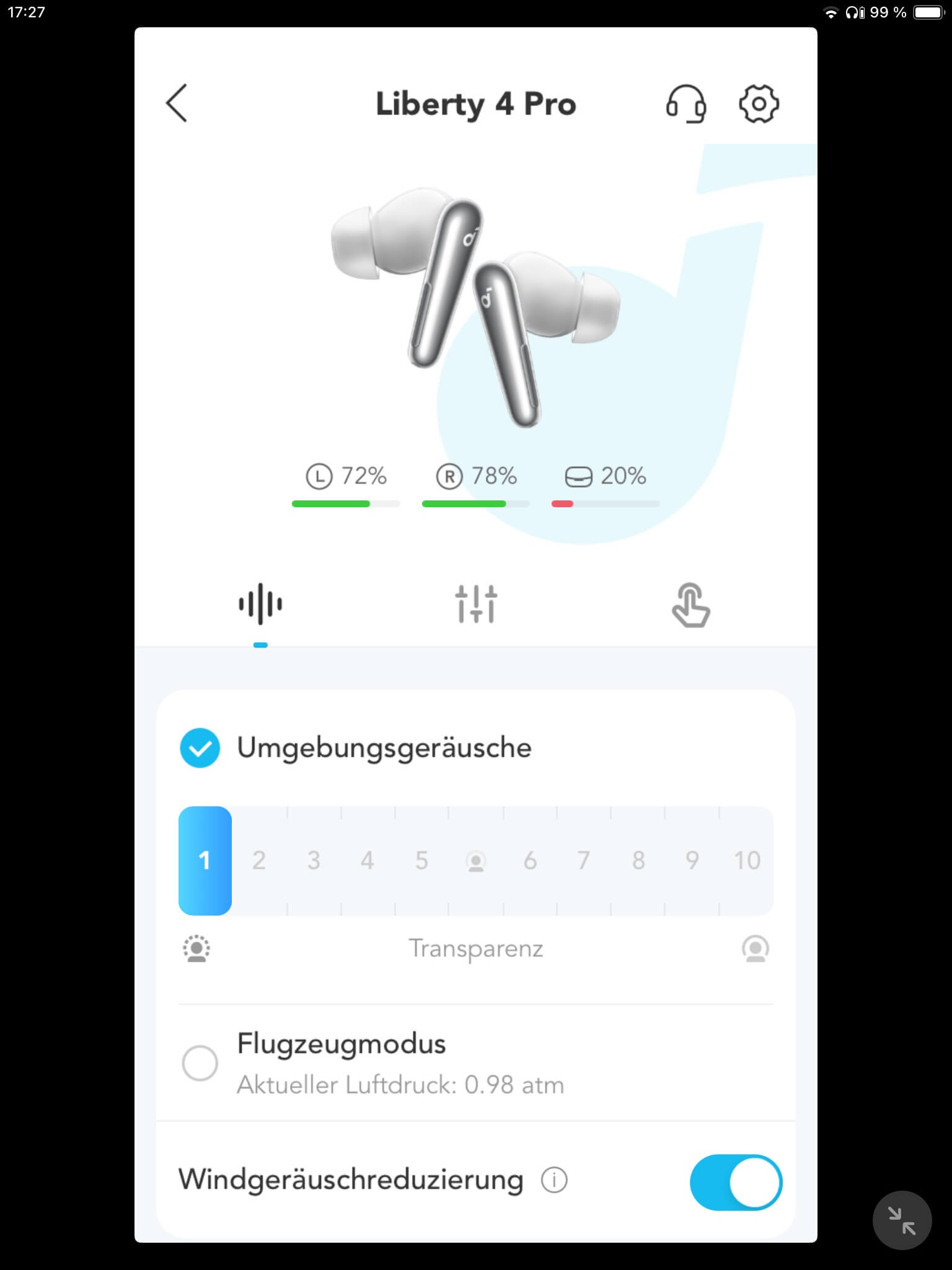 Zusätzliche Steuerungsmöglichkeiten bestehen über das Case, wobei die Funktionen per App anpassbar sind. Im Auslieferungszustand besteht Zugriff auf die Geräuschkontrolle, wodurch per Touch-Bar und Display zwischen den Modi gewechselt, aber auch die Intensität eingestellt werden kann. Hierbei entsprechen die Einstellungen eins bis fünf dem Transparenzmodus und sechs bis zehn der adaptiven Geräuschunterdrückung, während sich der Standardbetrieb zwischen fünf und sechs in der Mitte befindet. Insofern entspricht eins der höchsten Intensitätsstufe im Umgebungsmodus, was zunächst gewöhnungsbedürftig erscheinen kann, aber schnell verinnerlicht ist.