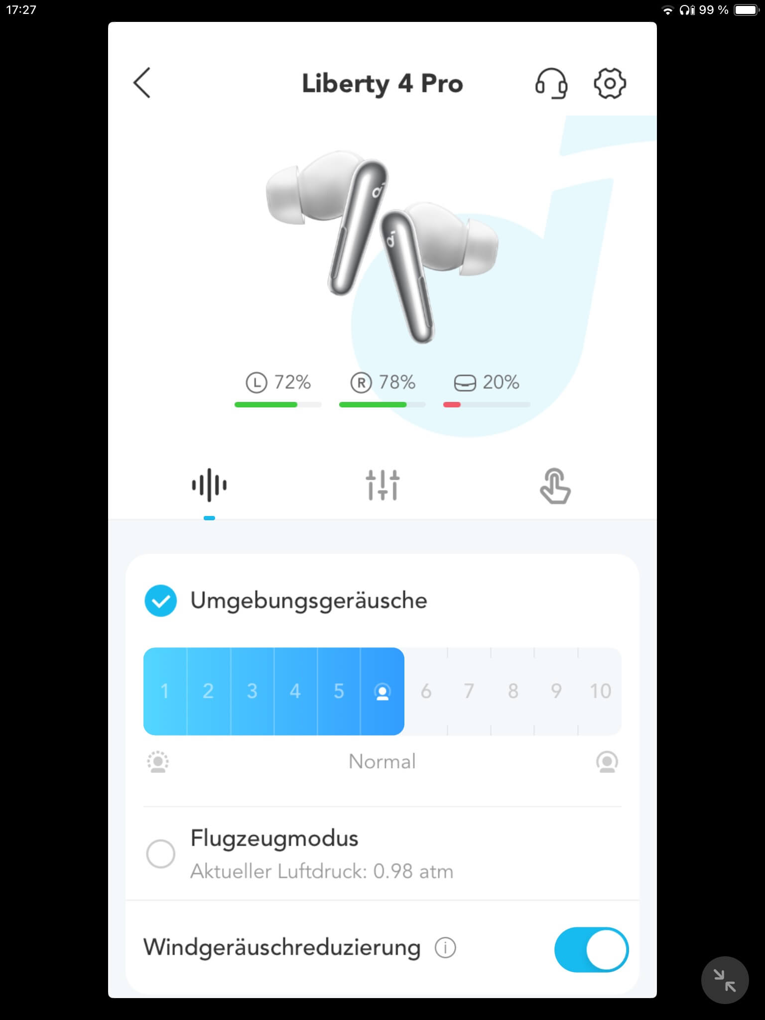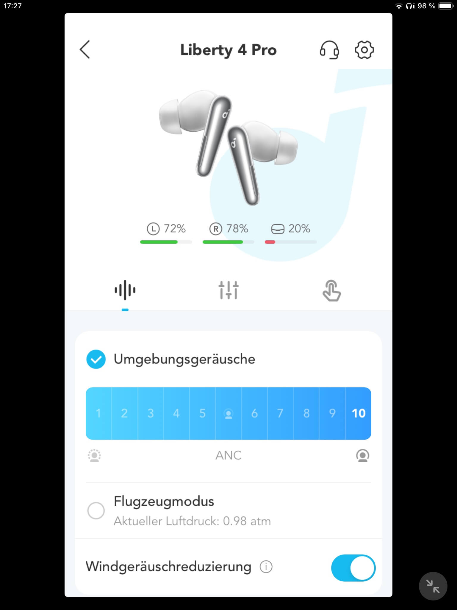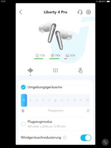 Als ein zentrales Element der App-Anbindung (Android und iOS) unterteilt sich die Umgebungsgeräuschkontrolle in einen adaptiven ANC- und einen statischen Transparenzmodus mit jeweils fünf Intensitätsstufen, eine zusätzliche Windgeräuschreduzierung und einen Flugzeugmodus. Dieser überwacht den Luftdruck und ermöglicht eine automatische oder manuelle Kalibrierung der Geräuschunterdrückung, sobald der Normalbereich verlassen wird.