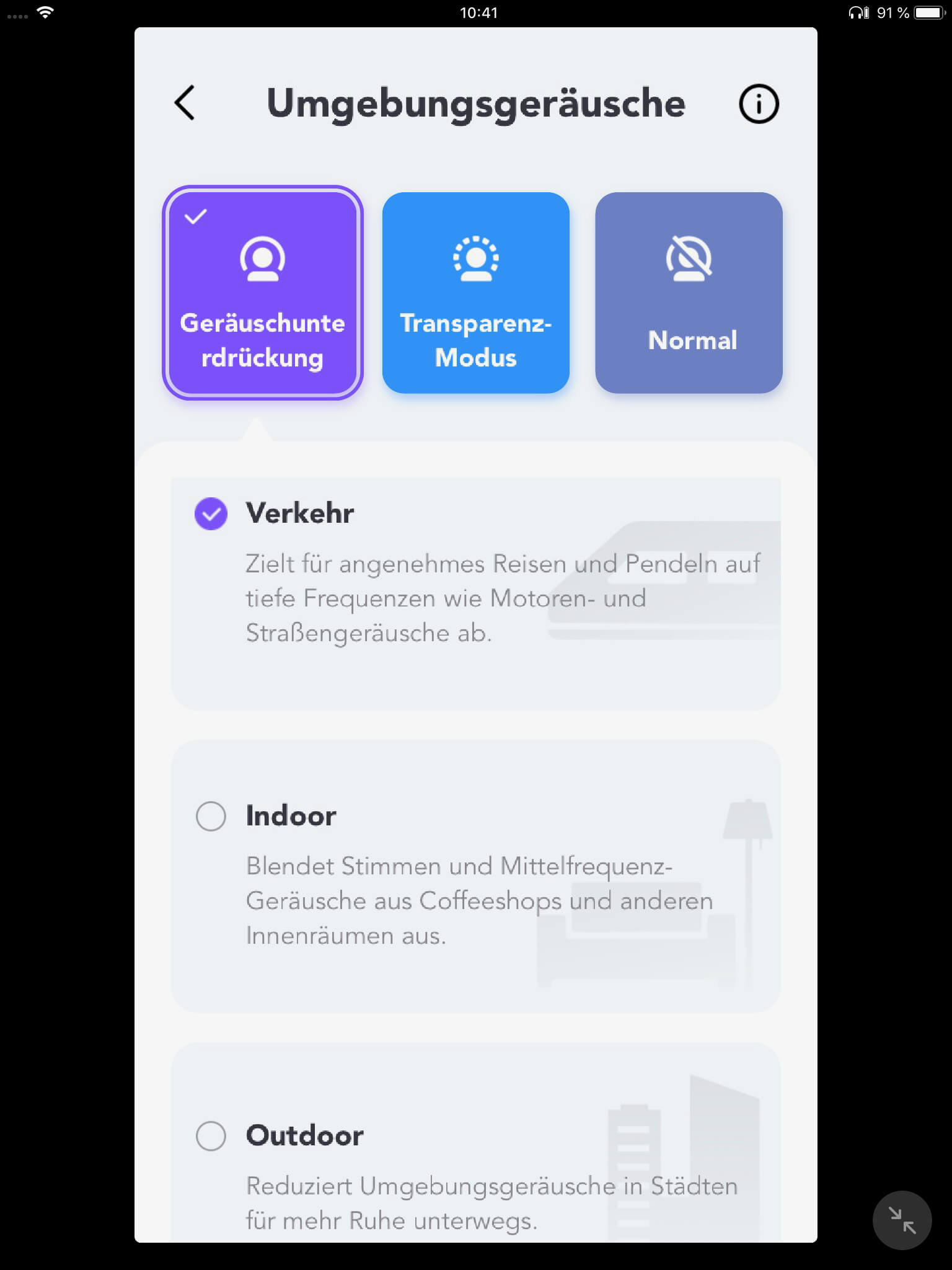 Welches Geräuschunterdrückungs- und Transparenzprofil genutzt werden soll, wird ebenfalls per App gesteuert. Während bei der Verstärkung von Außengeräuschen zwischen einem allgemeinen Umgebungs- und einem speziellen Stimmenmodus unterschieden wird, ist das Noise Cancelling auf drei Situationen einstellbar, und zwar den Indoor- oder Outdoor-Bereich sowie einen Verkehrsmodus zum Reisen und Pendeln.