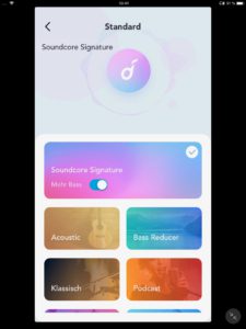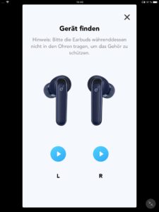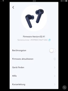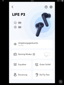 Die kostenlose Soundcore App für Android- und iOS-Geräte ist übersichtlich aufgebaut und bietet neben der Möglichkeit die Touch-Steuerung zu konfigurieren, Firmware-Aktualisierungen, einen Eartip-Test, eine Suchfunktion per Piepton, Zugriff auf einen Schlafmodus mit verschiedenen Ambient-Sounds und den Gaming-Modus. Dieser optimiert dem Hersteller zufolge die Synchronität von Bild und Ton sowie die Darstellung von Schritten, Schüssen und Stimmen, wobei der Klang insgesamt durchsetzungsfähiger und lauter empfunden wird. Dabei profitieren Filme und Video-Clips ebenfalls von einer geringeren Latenz und der guten Sprachverständlichkeit.