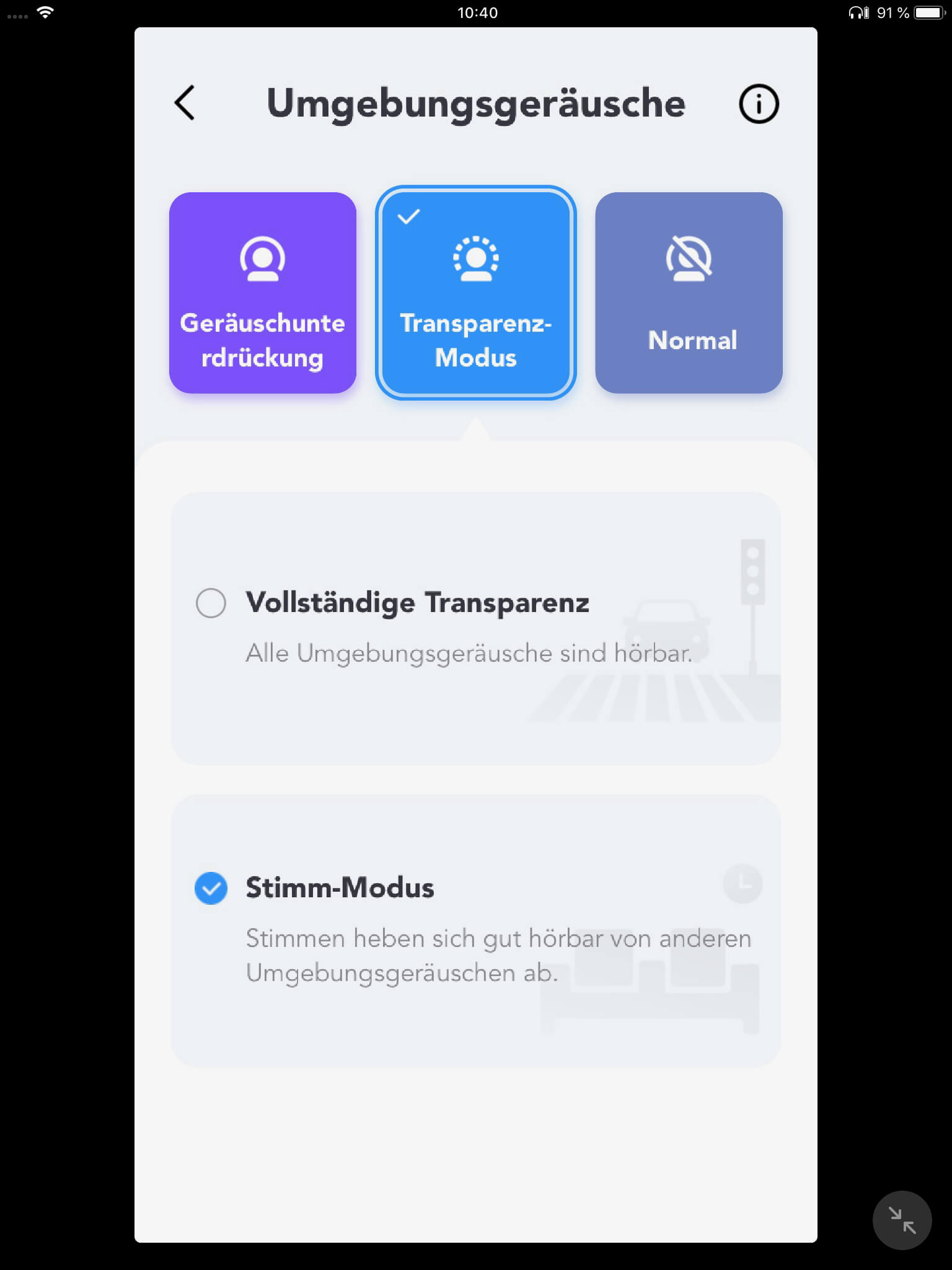 Eine Einschränkung stellt das Grundrauschen der beiden Transparenzmodi dar, da dieses bei einer niedrigen bis mittleren Lautstärke auch während der Wiedergabe wahrgenommen werden kann. Das ist im ANC-Betrieb nicht der Fall, auch wenn beim Pausieren ebenfalls ein leichtes Grundrauschen vorhanden ist. Ansonsten werden Außengeräusche jedoch sauber über die Mikrofone verstärkt, so dass der allgemeine Umgebungsmodus eine Orientierung im Umfeld ermöglicht. Der Stimmenmodus bietet hingegen selbst während der Wiedergabe eine verbesserte Sprachverständlichkeit, da der Bassbereich zusätzlich abgesenkt wird.