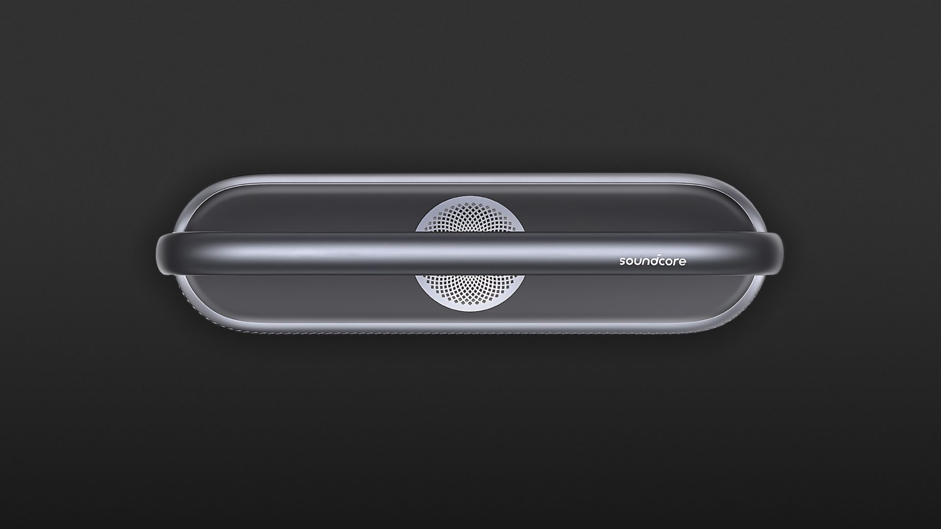 Die drei angebotenen Farben sind ein Hingucker, unser in hellem Anthrazit schimmerndes Testgerät (ca. 12 mm x 300 mm x 8,1 mm) gefiel uns richtig gut, und der fest verbundene Henkel ist nicht nur ergonomisch gelungen. Auf der Oberseite finden sich ein paar wenige Bedienelemente: ein ins Gehäuse leicht versenkter Drucktaster als „Hauptschalter“ sowie ein Bluetooth-Taster, einen für Spatial-Audio und eine weiterer für die Bassanhebung. In der Mitte gibts einen der insgesamt fünf verbauten Lautsprecher, rechts daneben teilen ein Minus-, ein Plus-Taster und ein Laufwerkstaster sich den Rest der mit gummiartigem Material überzogenen, leicht angeschrägten Bedienoberfläche. Diese ist allerdings anfällig für (fettige) Fingerabdrücke.