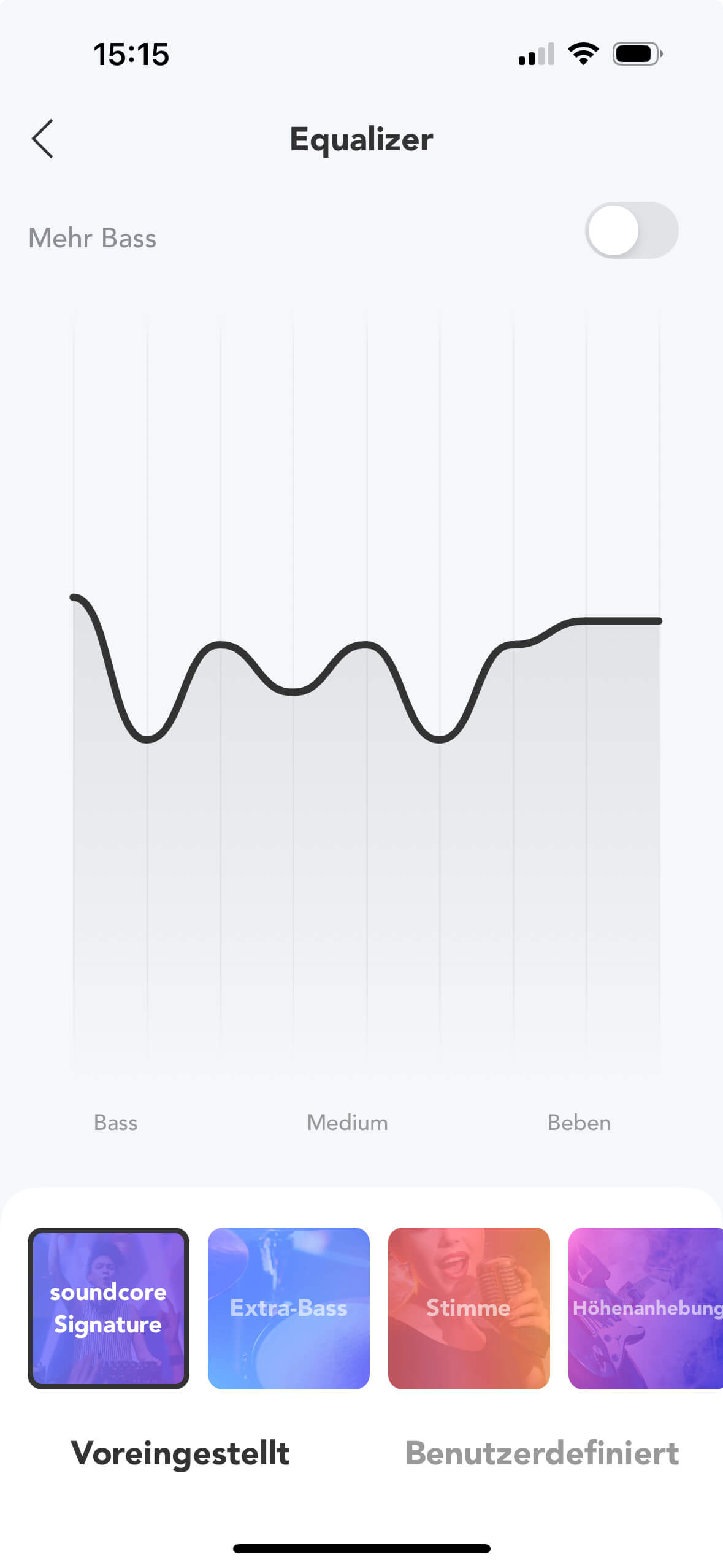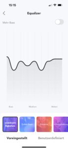 Neben der Spatial-Funktion kann per Knopfdruck dem Bass auf die Sprünge geholfen werden. Immer dann, wenn die Musik zum Tanzen auffordert, würde ich den drücken, Klangpuristen rümpfen bei der Bassenergie immer gerne die Nase, da den Mitten hier gerne mal die Definition genommen wird. Aber, der Druckknopf im wahrsten Sinne macht Spaß, zumal neben „Mehr Bass“ in der Soundcore-App noch ein paar Einstellungen warten.