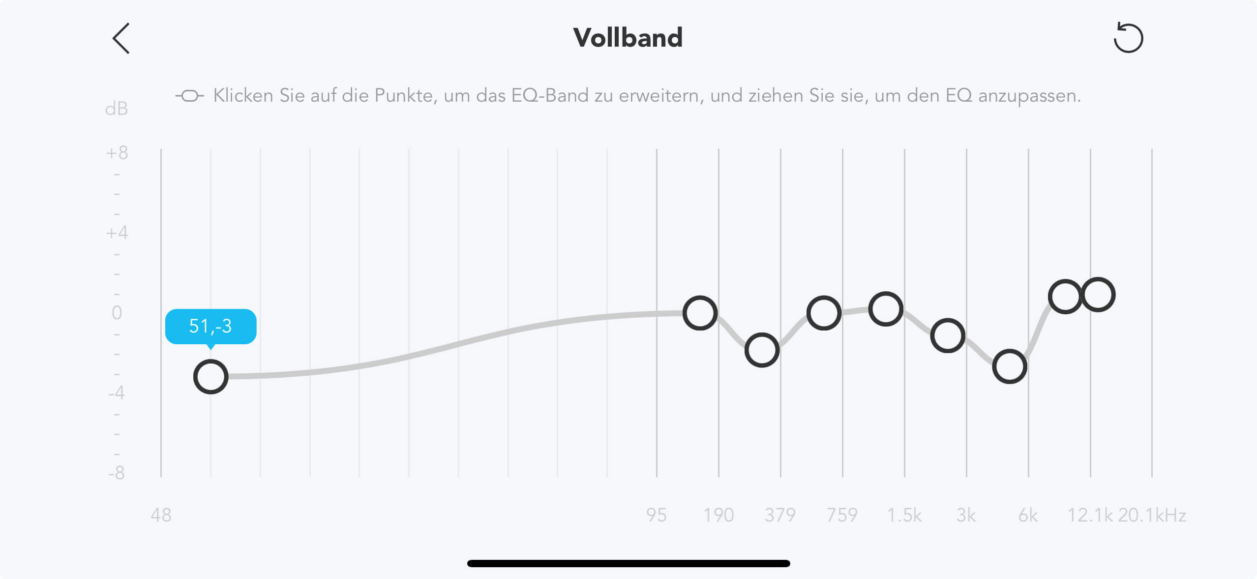 Für iOS und Android gibts wie üblich eine kostenfreie App, die neben den üblichen Verwaltungsaufgaben einen sehr frei konfigurierbaren EQ bereithält, bei dem nicht nur die neun Bänder um +/- 8 dB angehoben oder abgesenkt werden können, sondern auch die Bandbreite verändert werden kann. Es lassen sich auch eigene EQ-Einstellungen kreieren und sogar mit anderen Nutzern teilen, was spätestens dann Sinn macht, wenn ein weiterer Motion X600 zu einem Stereo-Paar gematcht werden soll.