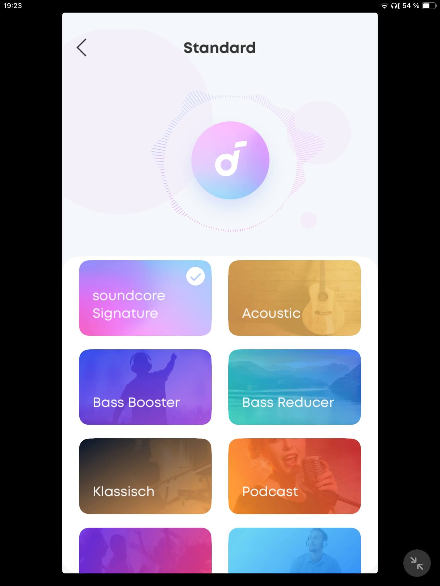 Die Klangregelung der App-Anbindung (Android und iOS) umfasst insgesamt 22 vorkonfigurierte Settings für einzelne Genres wie Dance, Rock und Jazz, aber auch für Podcasts oder zur Bass- und Höhenabsenkung. Über einen 8-Band-EQ lassen sich zudem eigene Einstellungen vornehmen, die als Presets speicherbar sind und im Freundeskreis geteilt werden können.