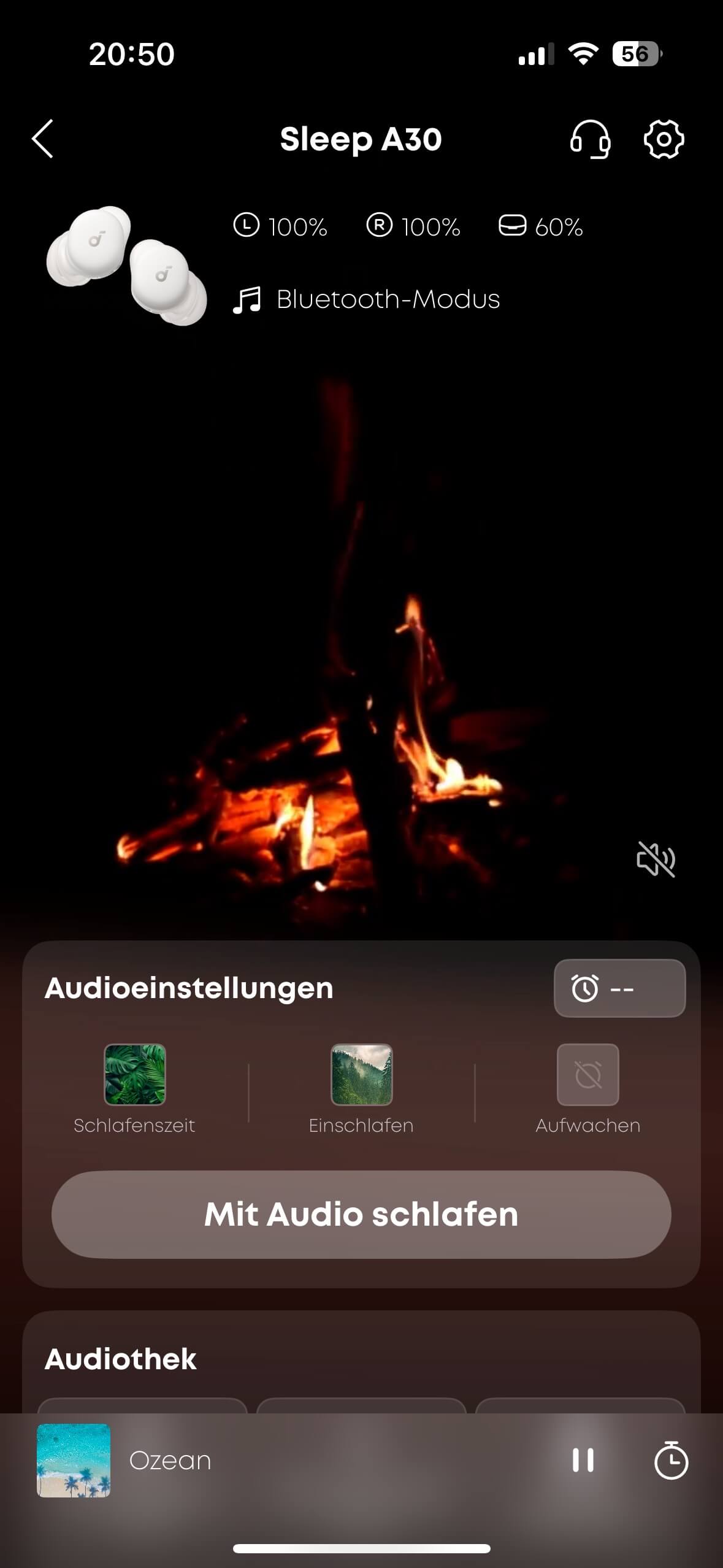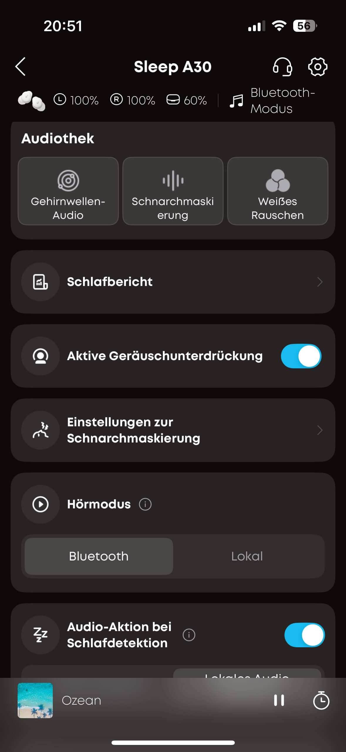 Die Belegungen lassen sich in der App einstellen, deren Installation unumgänglich ist, will man alle Funktionen der Soundcore Sleep A30 nutzen. Grundsätzlich kennen die Sleep A30 zwei Modi: Bluetooth-Modus, bei dem alles »wie immer« über den Zuspieler läuft, und einen lokalen Modus, bei dem die Bluetooth-Verbindung unterbrochen wird und lediglich ein lokal gespeicherter Sound spielt, um eine möglichst lange Akkulaufzeit zu ermöglichen.