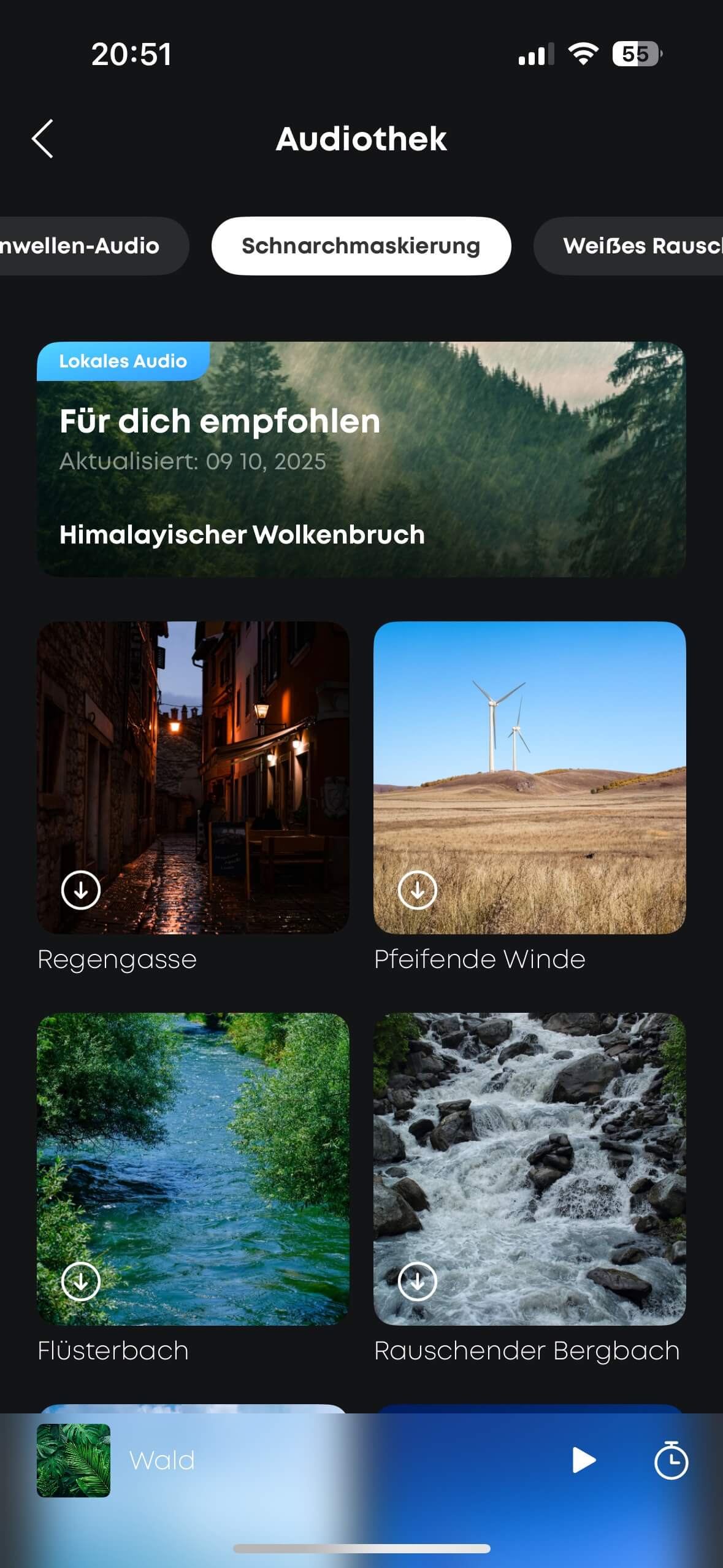 Schaltet ihr einen Sound aus der ersten Bibliothek hinzu, die „KI-Gehirnwellen-Audio“ betitelt ist, und sich aus einer Vielzahl entspannender Klänge und Soundteppiche zusammensetzt, wähnt ihr euch plötzlich nicht mehr im Bett, sondern in einer Yoga-/Entspannungssession – unter einem weiten Himmel und der Unendlichkeit tief verbunden – was durchaus eine entspannende Wirkung erzielen kann.