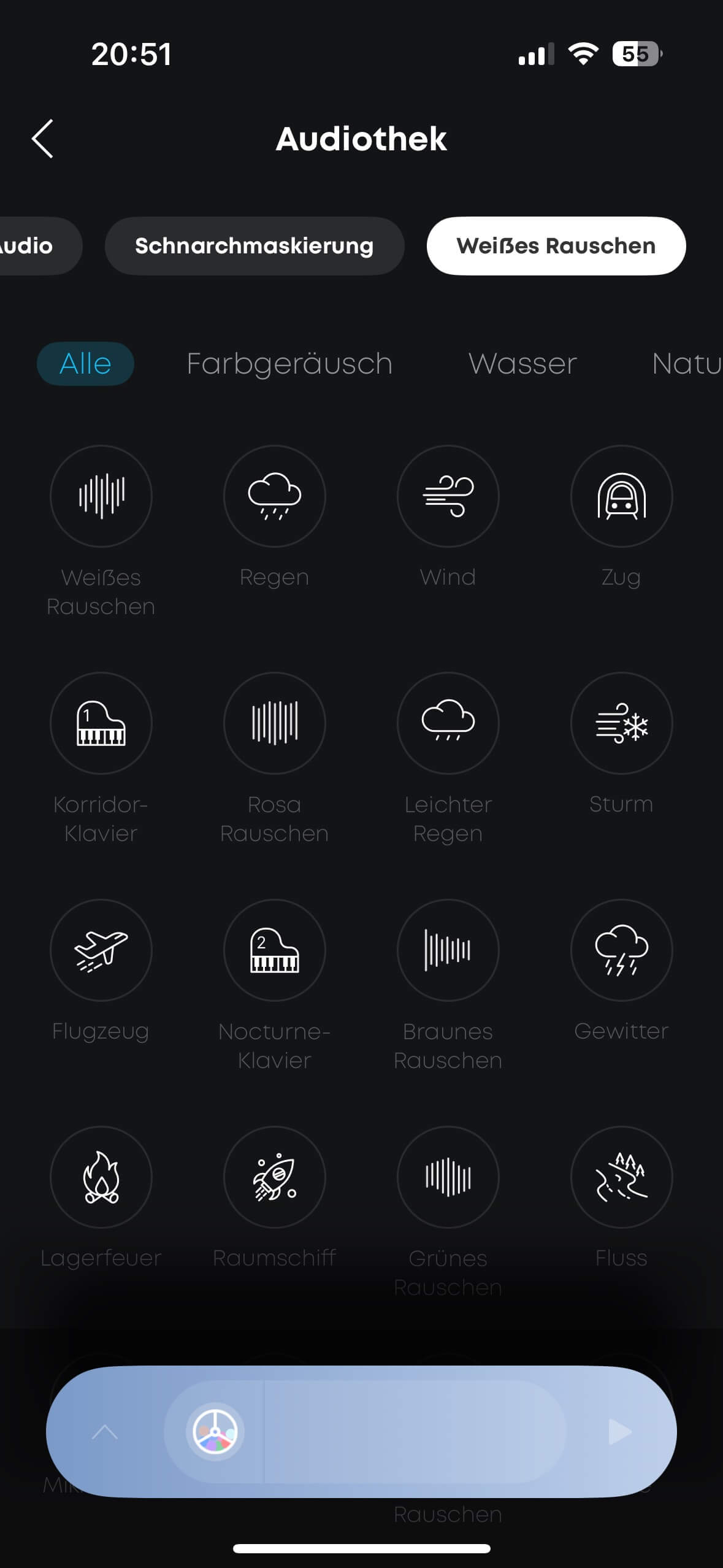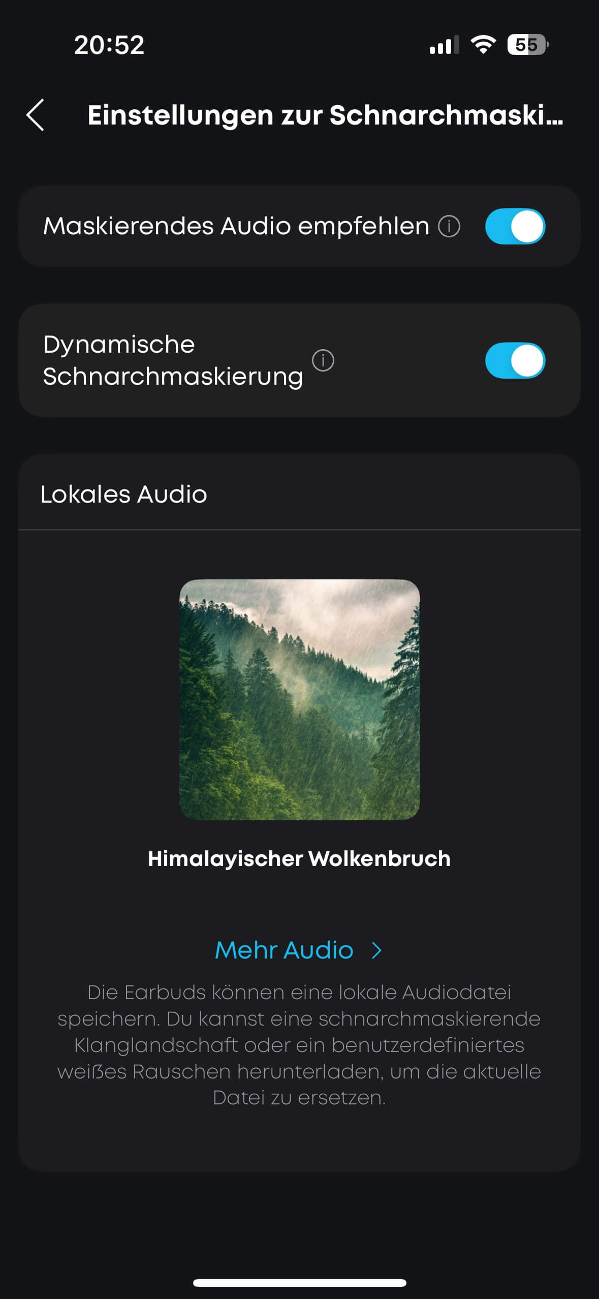 Durch den Einsatz der unterschiedlichen Sounds und Klänge könnt aber vielleicht doch besser schlafen. Wird von „Maskierung“ gesprochen, meint es meines Erachtens allerdings eher „Ablenkung“. Dann gehe ich mit diesen Features soweit d’accord. Dass es nämlich mit dem atmosphärischen Rauschen – egal ob Regen, Plätschern oder weißes Rauschen – tatsächlich gelingt, von dem enervierenden Schnarchen eines Bettnachbarn abgelenkt zu werden, um so etwas besser in den Schlaf finden. Eine Maskierung im Sinne von „Abdecken“ oder „Auslöschen“ trifft – bis auf die ANC-induzierten verringerten Tief-Frequenzanteile des Schnarchens und der sowieso schon durch die mechanische Abschottung eingedampfte Gesamtlautstärke – nicht zu.
