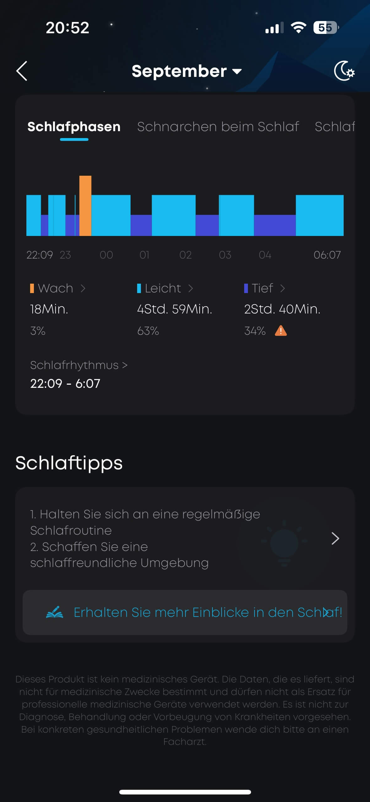 Darüber hinaus erstellt die App anhand von Bewegungsdaten, die über die In-Ears gemessen werden, einen Schlafreport, in dem die Schlaf- und Wachphasen und die Gesamtschlafzeit zusammengestellt sind, angereichert mit Daten zum Schnarchen und der Bewegung während dieser Zeit. Wie genau und aussagekräftig diese Daten sind, kann ich nicht beurteilen. Sie passen aber in unsere Zeit, indem sie Futter für die Selbstvermessung und Zustandsoptimierung liefern.