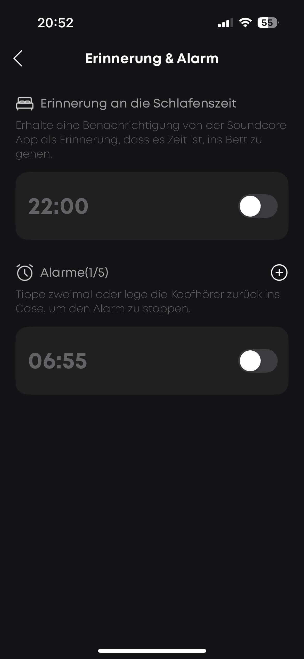 Ihr könnt zwei Alarme einstellen. Den ersten, um ins Bett zu gehen, einen zweiten zum Aufwachen. Das ist ganz im Sinne einer gleichbleibenden Abend- und Morgenroutine. Ihr könnt festlegen, ob der Sound im lokalen Modus weiterspielt, wenn ihr eingeschlafen seid, oder einfach stoppt.