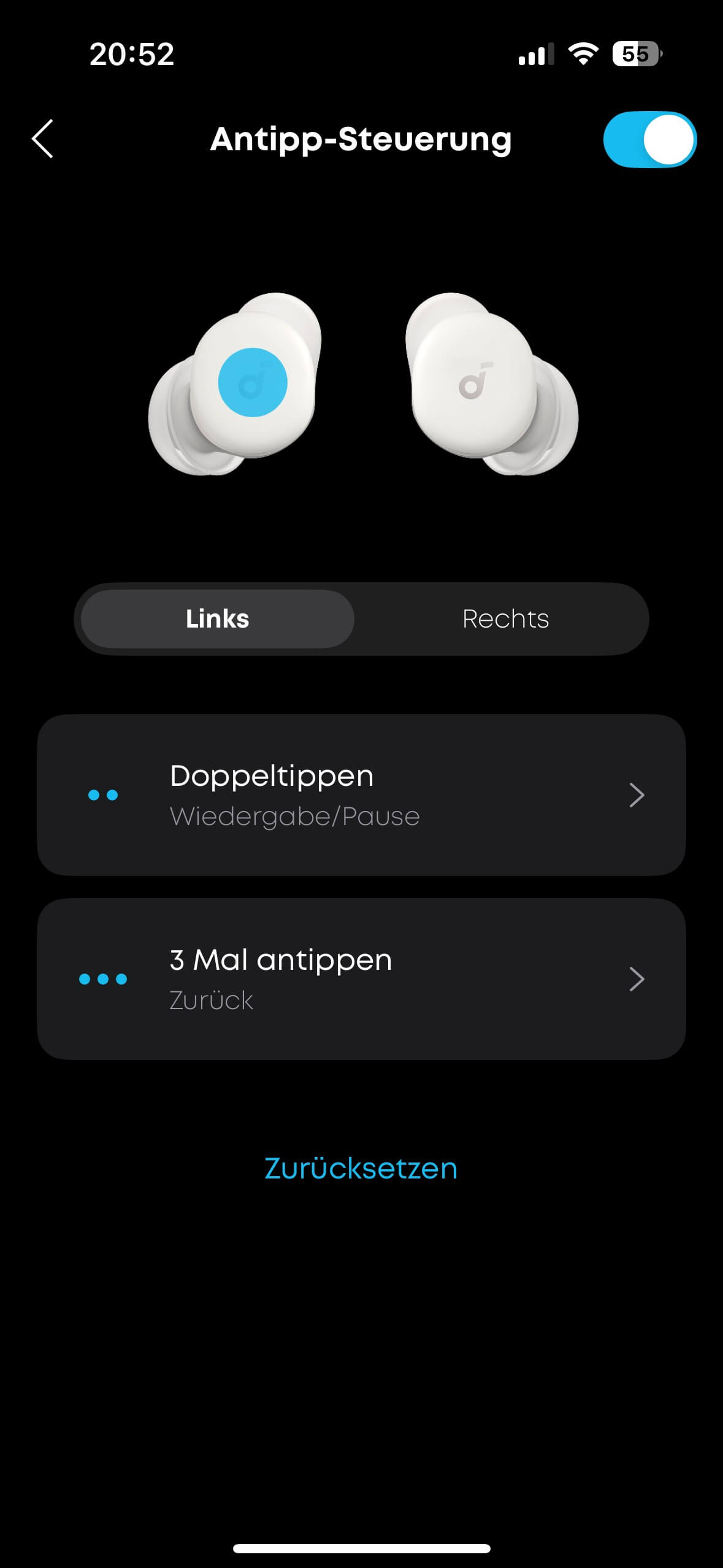 Die Soundcore Sleep A30 koppeln sich via Bluetooth 5.3 schnell und unkompliziert und sind sofort spielbereit. Über die Touchflächen auf der Rückseite der In-Ears, die glücklicherweise nicht so empfindlich sind, lassen sich die A30 steuern, wobei es nur Gesten für zweimal- und dreimal Tippen gibt.