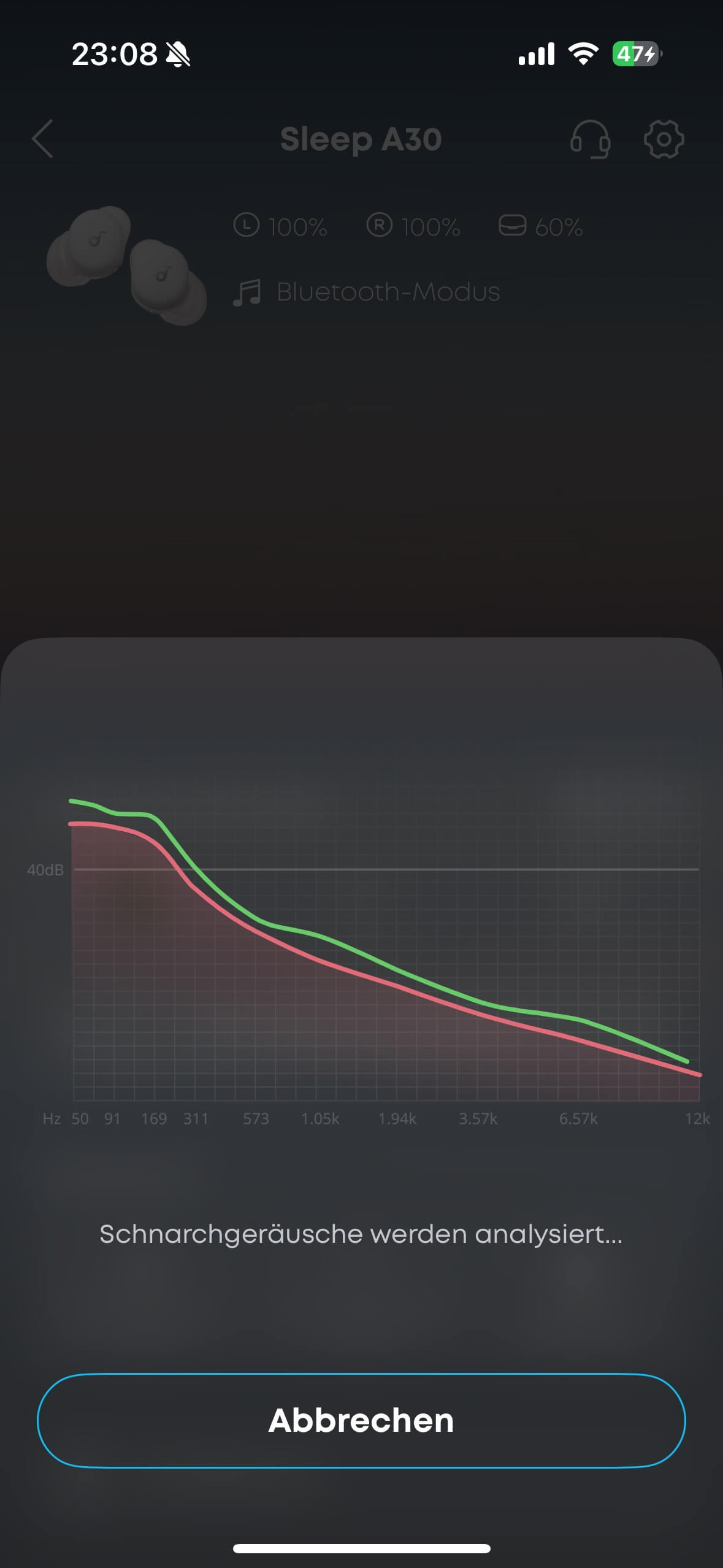 Hierbei kommt dann auch das Ladecase zum Tragen, worin ein Mikrofon verbaut ist, welches die Lautstärke des Schnarchens misst. Anhand eines erstellten Graphen spricht der Schlafkopfhörer sodann eine Soundempfehlung aus, die am geeignetsten erscheint, genau dieses Schnarchen effektiv zu überdecken. Dieses Maskierungsfile könnt ihr dann auf die In-Ears übertragen und so auch ohne Bluetooth-Verbindung, im lokalen Modus, abspielen. Zusätzlich bietet das Case eine kontinuierliche Messung des Schnarchens an, um so die Lautstärke des Sounds automatisch daran anzupassen – diese Funktion habe ich allerdings nicht wahrgenommen.