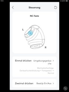 Das Einschalten der Hörer, die Multipoint-Verbindungen mit zwei Geräten gleichzeitig unterstützen, erfolgt durch ein kurzes Gedrückthalten des Power-Tasters an der linken Seite, während das System bei einem längeren Gedrückthalten direkt in den Pairing-Modus zum Koppeln versetzt wird. Auch der NC-Taster zum Umschalten zwischen ANC-, Transparenz- und Grundmodus ist linksseitig zu finden, wobei per App festgelegt werden kann, zwischen welchen Modi gewechselt werden soll. Ebenfalls einstellbar ist, ob zweifaches Drücken die BassUp-Funktion der Soundcore Space Q45 ein- und ausschaltet. Die weiteren Bedienelemente befinden sich an der rechten Hörerschale. Dabei lässt sich die Wiedergabe über den Play/Stop-Taster steuern, der darüber hinaus zum Annehmen sowie Beenden von Telefonaten dient und bei zweimaligem Drücken den Sprachassistenten aktiviert. Ein kurzes Gedrückthalten lehnt hingegen Anrufe ab und ermöglicht ein Stummschalten der Mikrofone. Via Plus- und Minustaster kann zudem die Lautstärke geregelt werden und eine Titelauswahl erfolgen, indem durch ein Gedrückthalten des Plustasters vor- und per Minustaster zurückgesprungen wird. Im Gegensatz zum NC-Taster sind die Bedienelemente zur Gerätesteuerung nicht per App konfigurierbar, was eine wünschenswerte Erweiterung darstellt. Funktionieren tut die Remote jedoch tadellos. Auch die Funkverbindung erwies sich während der Testphase als sehr stabil, so dass innerhalb von Gebäuden problemlos mehrere Räume und ein Stockwerk überbrückt werden konnten. Im Freien war eine Distanz von 30 Metern zu erreichen.