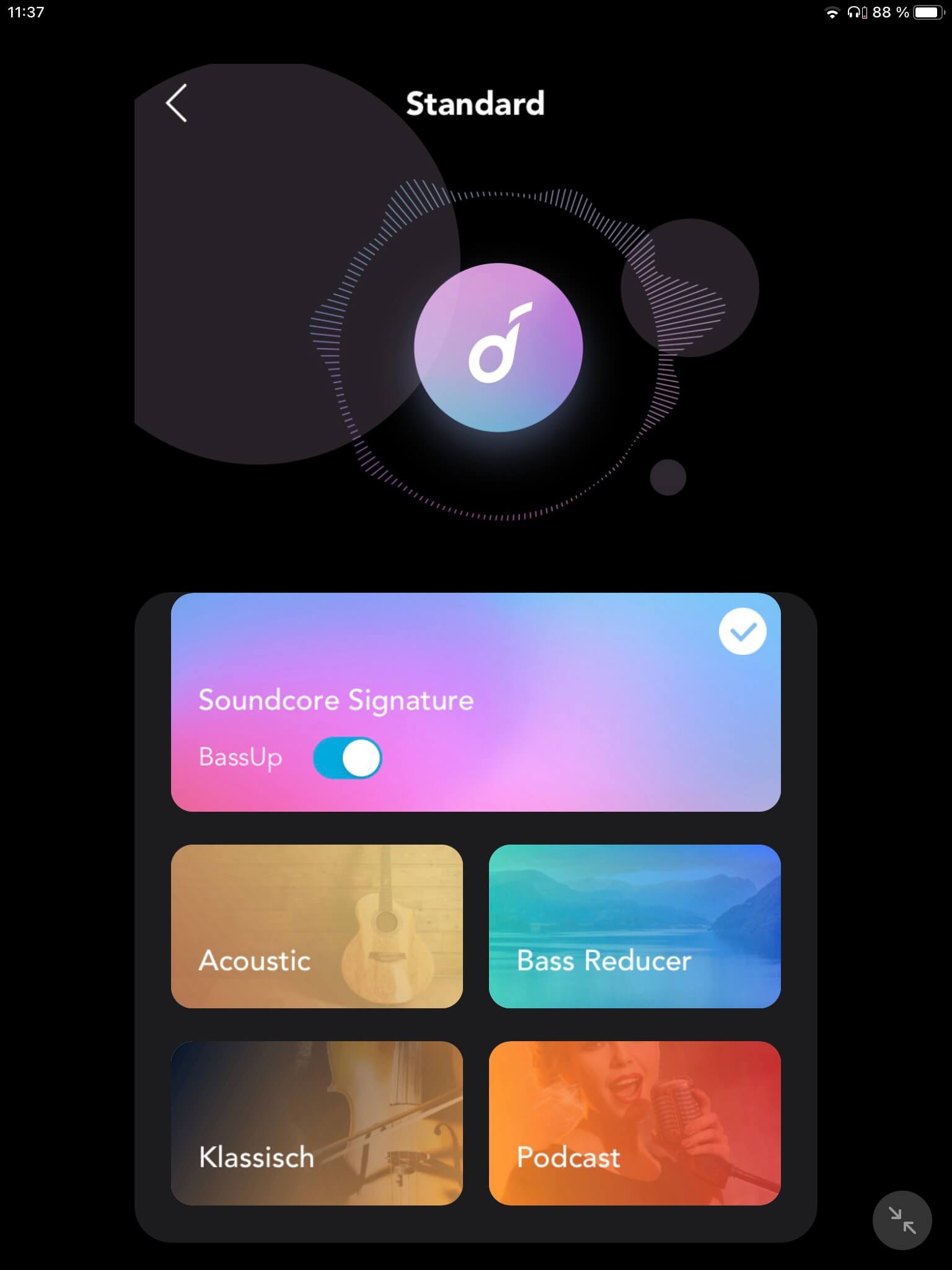 Die App-Anbindung (Android und iOS) der Soundcore Sport X10 stellt eine Klangregelung zur Verfügung, die eine umfangreiche Auswahl an 20 vorkonfigurierten Settings für unterschiedliche Genres wie Pop, Rock oder Hip-Hop, Podcasts und gesprochene Inhalte sowie eine Ausrichtung mit verstärkten oder abgeschwächten Höhen etc. bietet. Darüber hinaus lässt sich beim Grundklang die BassUp-Funktion aktivieren, während ein EQ mit acht Bändern eigene Einstellungen ermöglicht, die als Preset speicherbar sind.