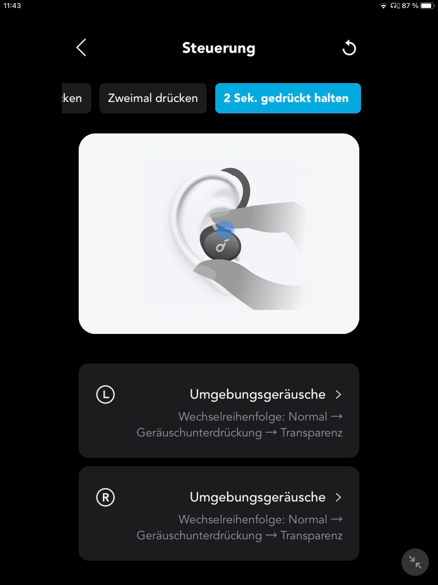- Grundrauschen im ANC- und Transparenzmodus
