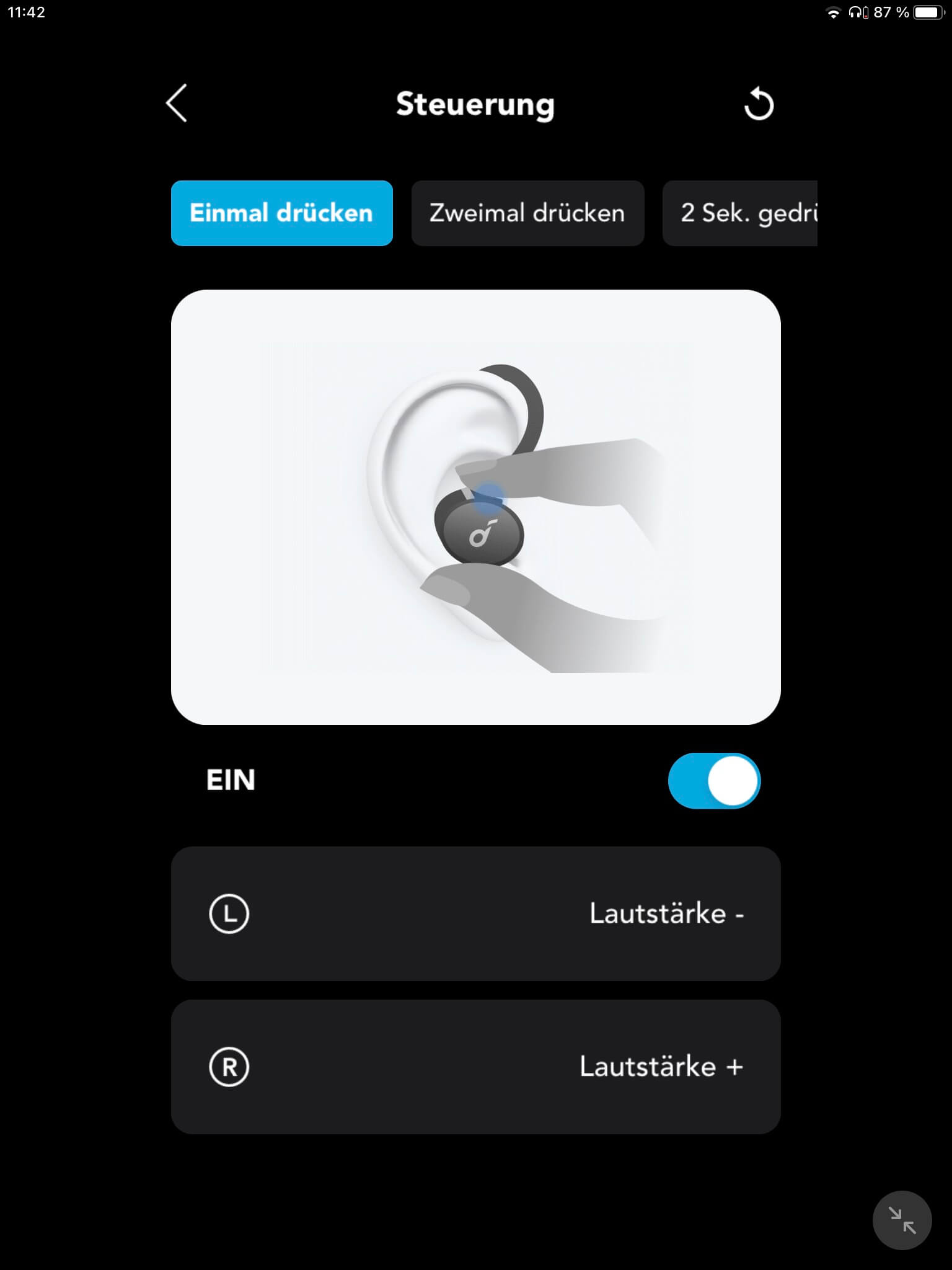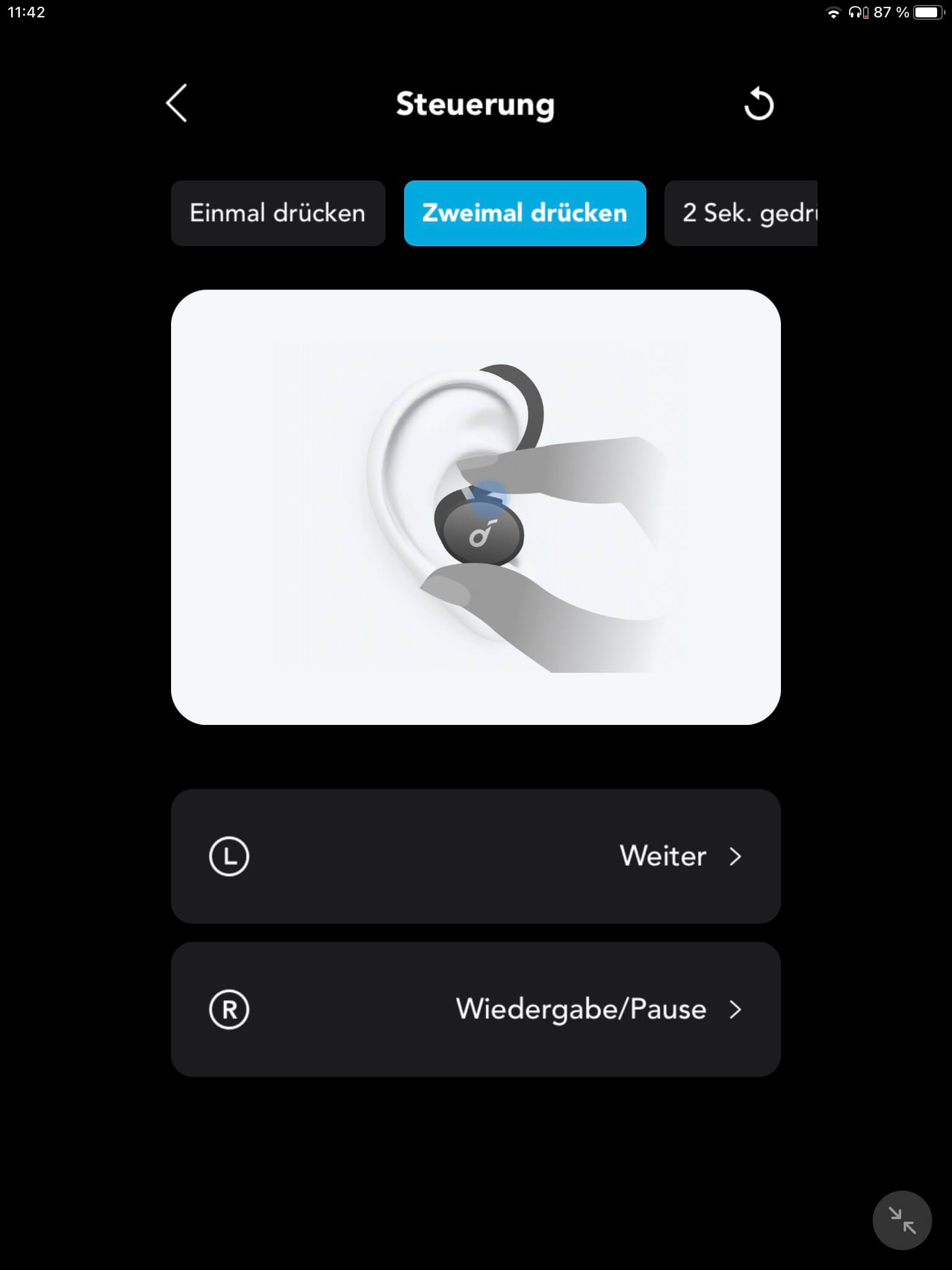 Ist eine Funkverbindung hergestellt, kann die Lautstärke durch Drücken des linken Tasters verringert und über den rechten Hörer erhöht werden. Zudem lassen sich beidseitig Anrufe durch einfaches Drücken annehmen. Ein doppeltes Drücken des linken Tasters dient in der Werkseinstellung hingegen zum Vorspringen bei der Titelauswahl, während über den rechten Hörer die Wiedergabe gesteuert wird. Darüber hinaus kann durch ein Halten zwischen Grundmodus und Geräuschunterdrückung umgeschaltet werden, wobei sich per App auch der Transparenzmodus hinzufügen lässt. Die Tasterbelegung der Sporthörer ist zwar nicht vollkommen frei konfigurierbar, da einmaliges Drücken für die Lautstärkeregelung reserviert ist und der Sprachassistent nur im Single-Modus aufgeführt wird. Von diesen Einschränkungen abgesehen, kann die Remote jedoch an die eigenen Bedürfnisse angepasst werden. Aufgefallen ist, dass die Steuerung nicht direkt, sondern mit einer kurzen Verzögerung erfolgt, was als gewöhnungsbedürftig empfunden werden kann. Dabei besitzen die Taster einen geringen Druckwiderstand und sind recht leichtgängig.