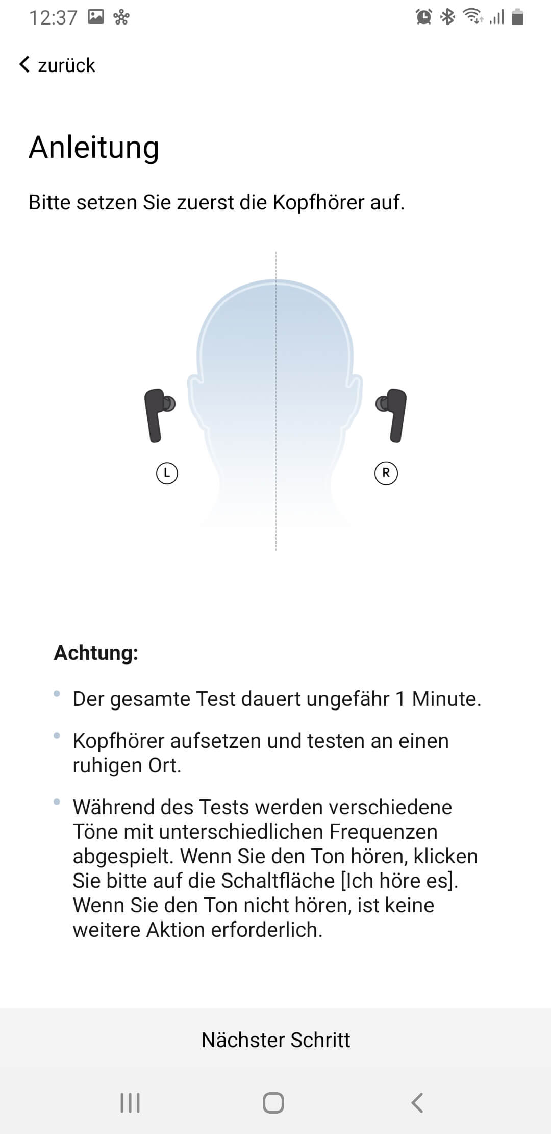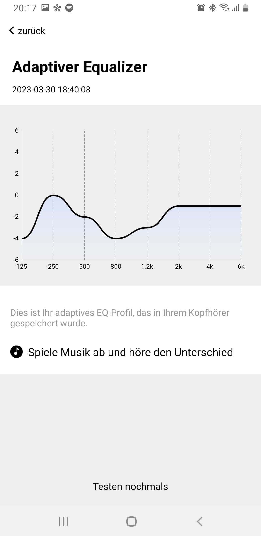 Ein besonderes Highlight der neuen App-Version 1.2.8 ist die personalisierte Klanganpassung. Hier absolviert man einen kleinen Hörtest mit Sinustönen in drei unterschiedlichen Lautstärken in acht Frequenzbändern woraus dann eine entsprechende Equalizer-Kurve erstellt wird. Macht man diesen jederzeit wiederholbaren Test sorgfältig, bekommt man im Ergebnis eine deutliche Klangverbesserung. Der einzige Nachteil: Der Algorithmus arbeitet hier subtraktiv. Wenn man also einen A/B-Vergleich macht, klingt das unbearbeitete Signal entsprechend immer etwas lauter, was einen Vergleich natürlich schwer macht. Noch etwas problematischer ist der Umstand, dass die Absenkung von der maximal möglichen Lautstärke des Hörers abgezogen wird, was je nach Stärke der Entzerrung dazu führen kann, dass die In-Ears auch bei maximaler Lautstärke ein bisschen zu leise sind.