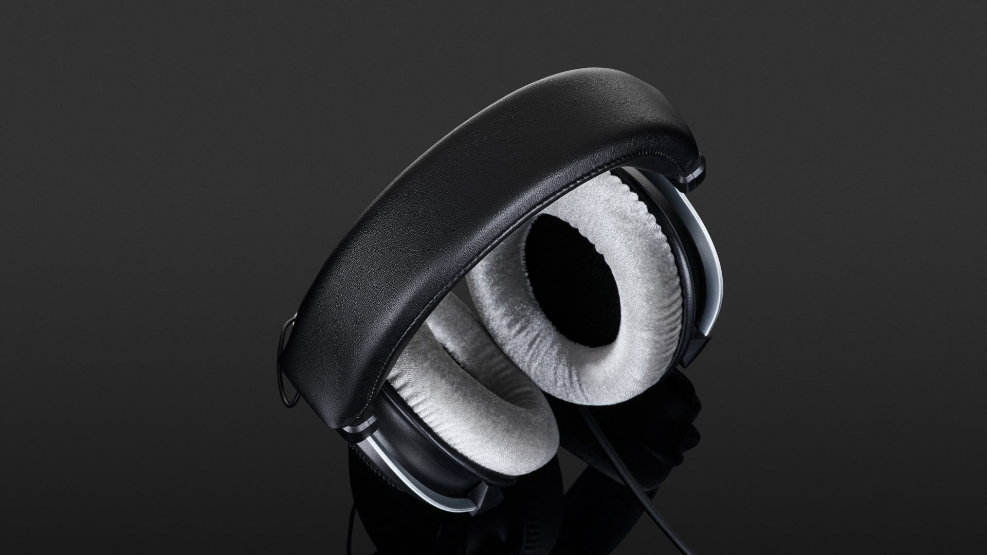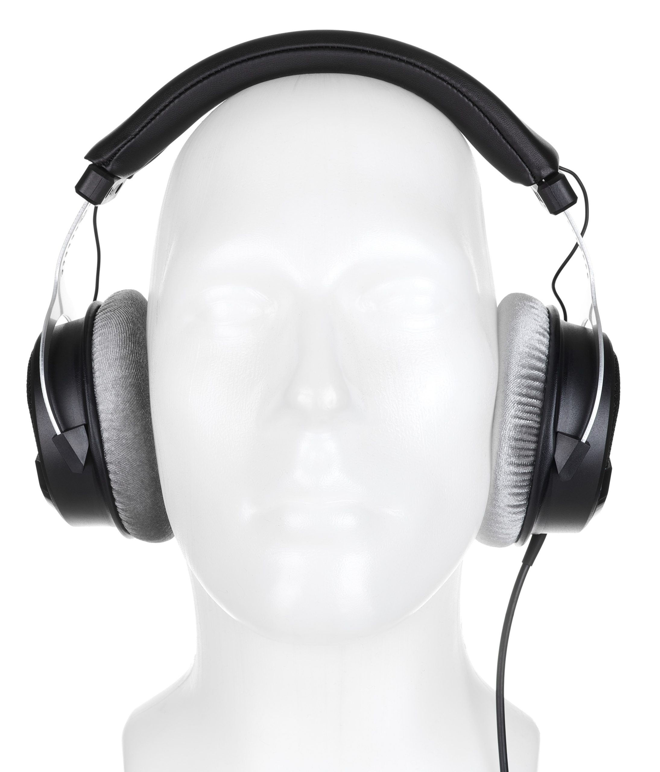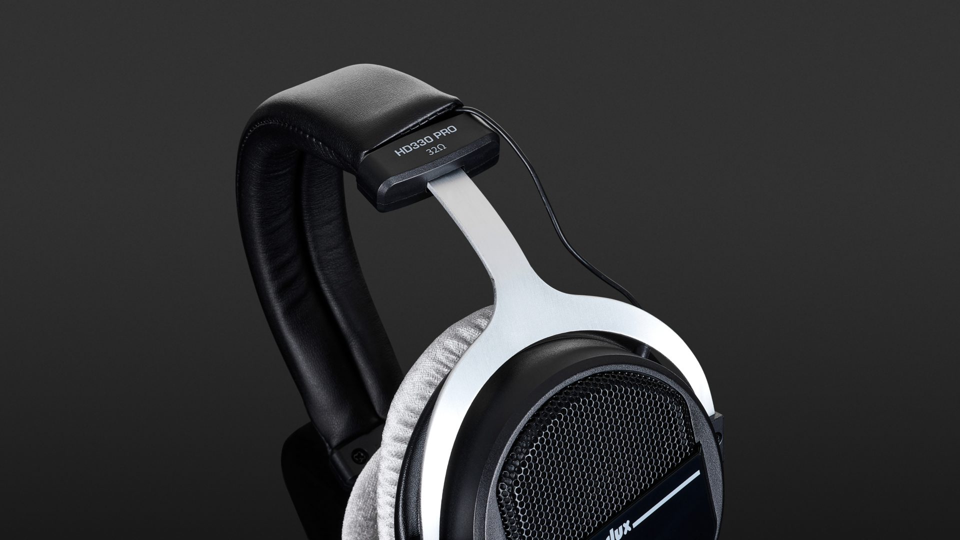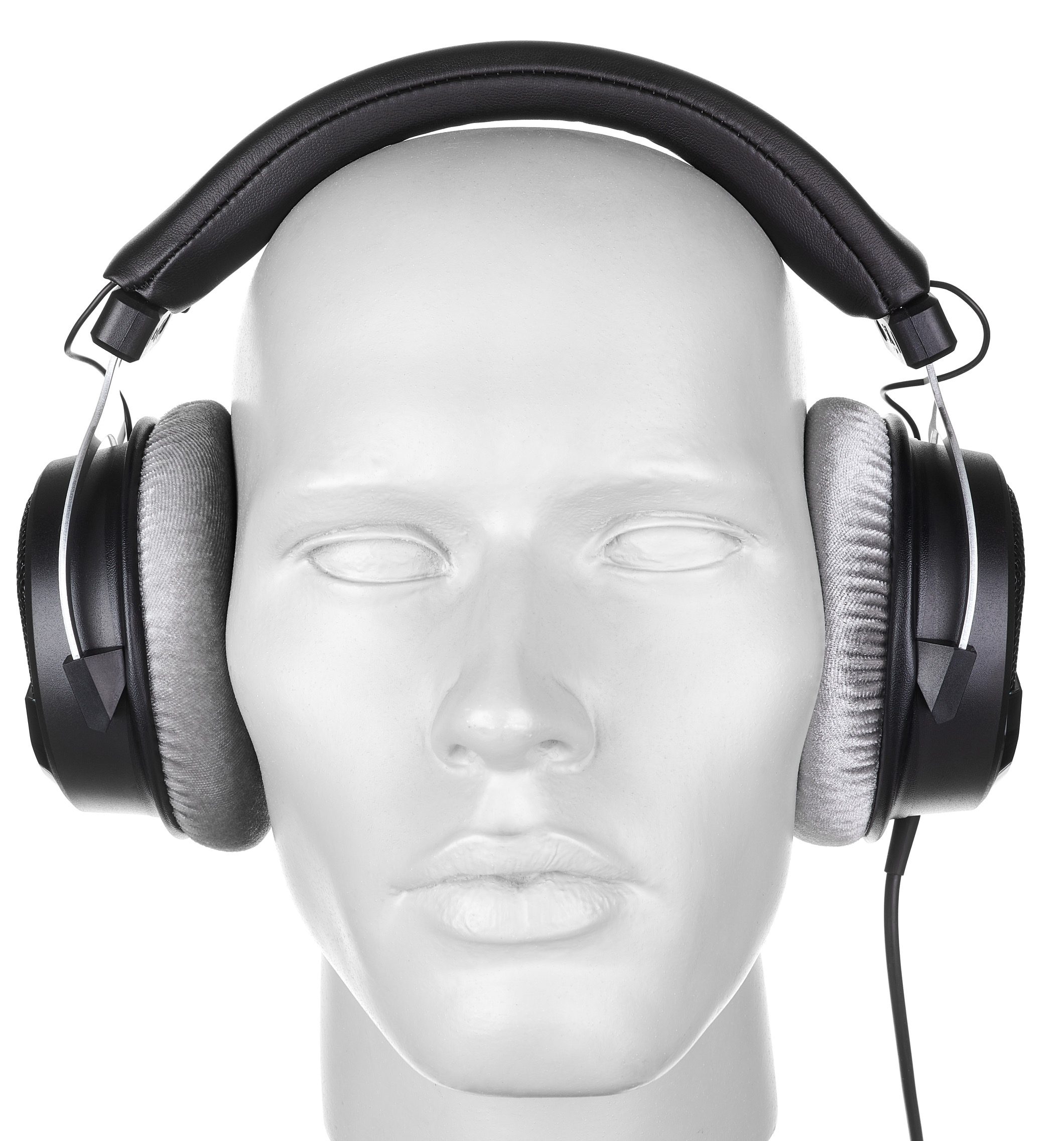 Bauartbedingt sind die HD330Pro schon etwas wuchtigere „Kannen“, die es sich mit 315 Gramm auf dem Haupt des Lauschenden bequem machen. Wobei sich das Gewicht dank buschiger Ohr- und Schädel-Polster sehr angenehm auf dem Kopf verteilt. Alle drei Polster lassen sich bei Bedarf abnehmen und tauschen. Von der gesamten Anmutung, aber auch insbesondere von den grauen Ohrpads und den Positionen der Verschraubungen her, erinnert der HD330 ein bisschen an den DT 990 Pro von Beyerdynamic. Ob das nun beabsichtigt ist, oder man beim Bau eines halboffenen, ohrumschließenden Hörers prinzipiell zwangsläufig bei diesem Design landet, möchte ich an dieser Stelle mal offenlassen. Eine weitere – eher unerfreuliche – Design-Gemeinsamkeit möchte ich nicht unerwähnt lassen: Die Verbindungsleitung zwischen linkem und rechtem Hörer wird nämlich bei beiden Hörern durch das Kopfband geführt und kommt dann einfach „irgendwie“ darunter hervor, was nicht nur optisch unschön wirkt, sondern auch das Polster etwas abstehen lässt. Das ist beispielsweise beim Beyerdynamic DT 1990 Pro deutlich besser gelöst, denn hier gibt es eine Aussparung im Kunststoff, durch die das Kabel ordentlich nach außen geführt wird. Das 2,5 Meter lange Anschlusskabel ist fest verlötet und wird aus dem linken Hörer herausgeführt. Es endet in einem Stereo-Miniklinkenstecker, der mit dem beiliegenden Adapter auf Standard-Klinke expandiert werden kann.