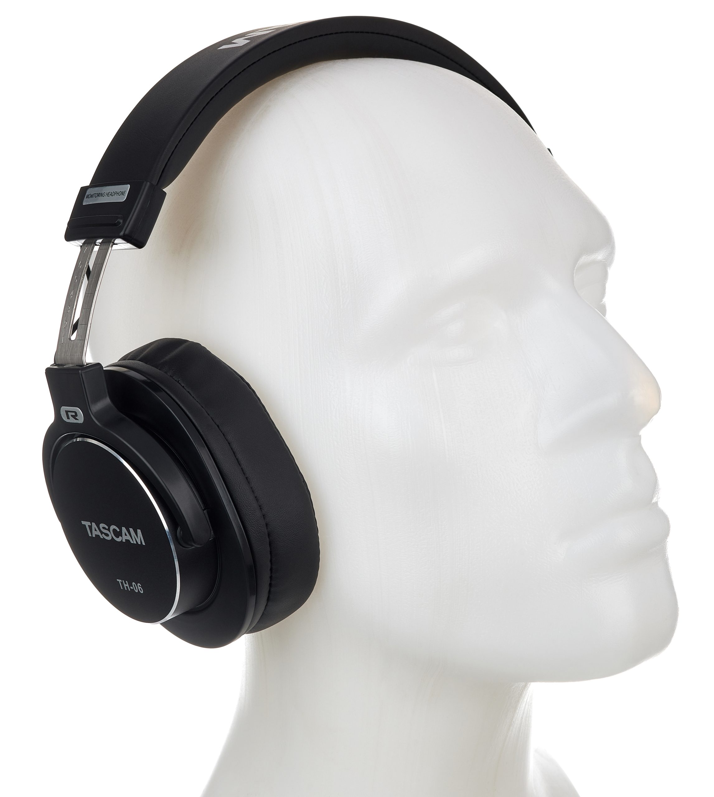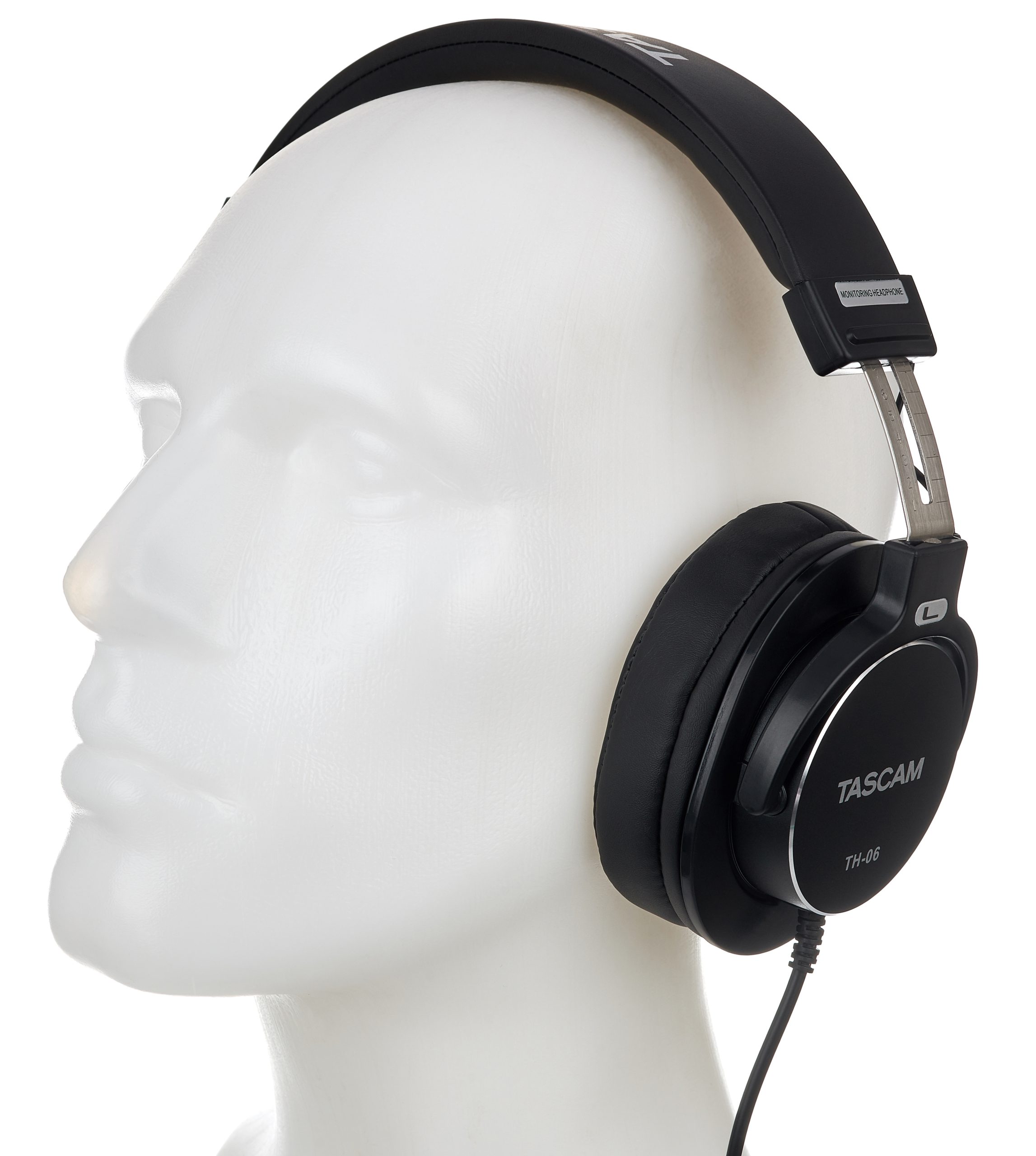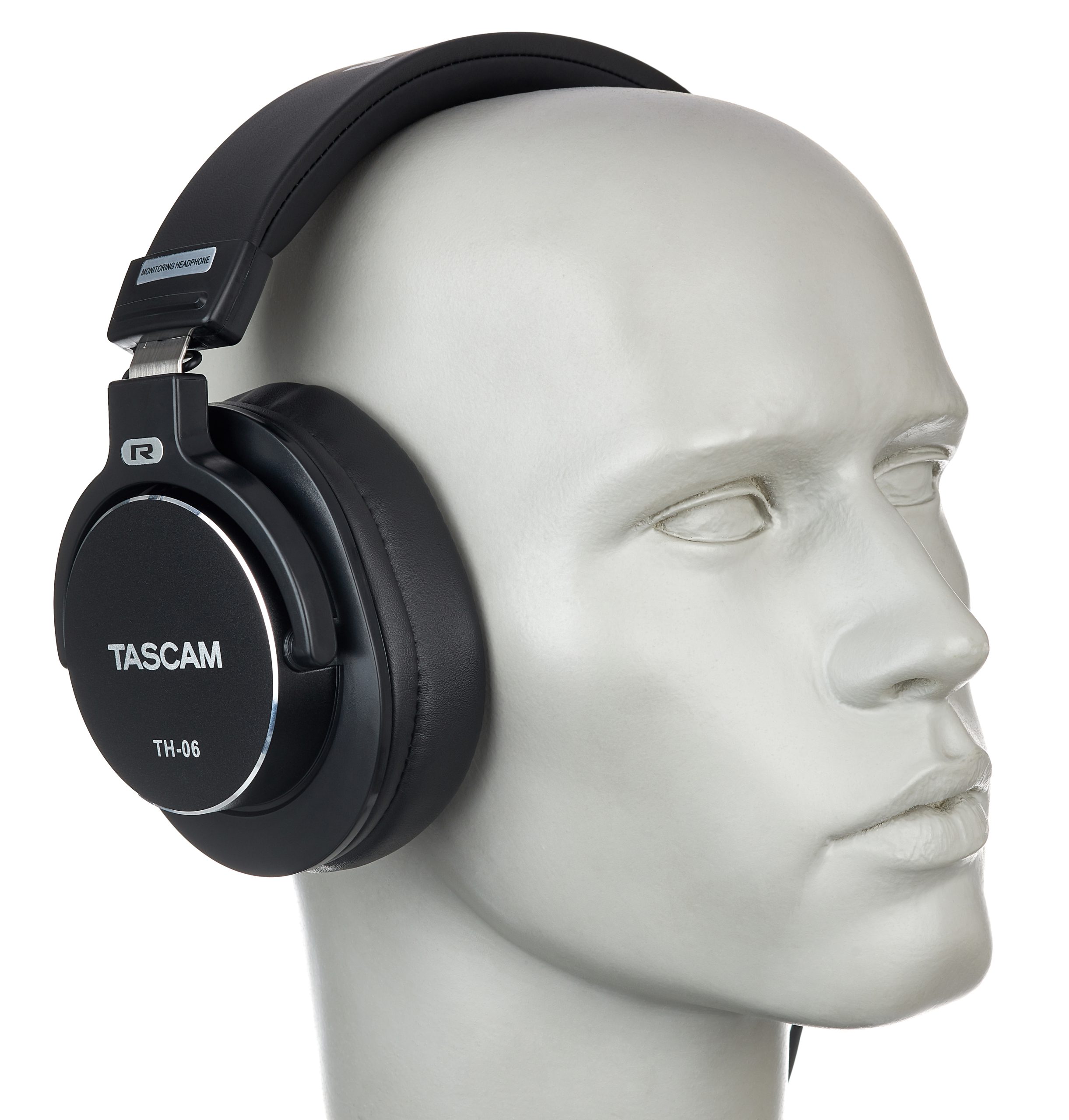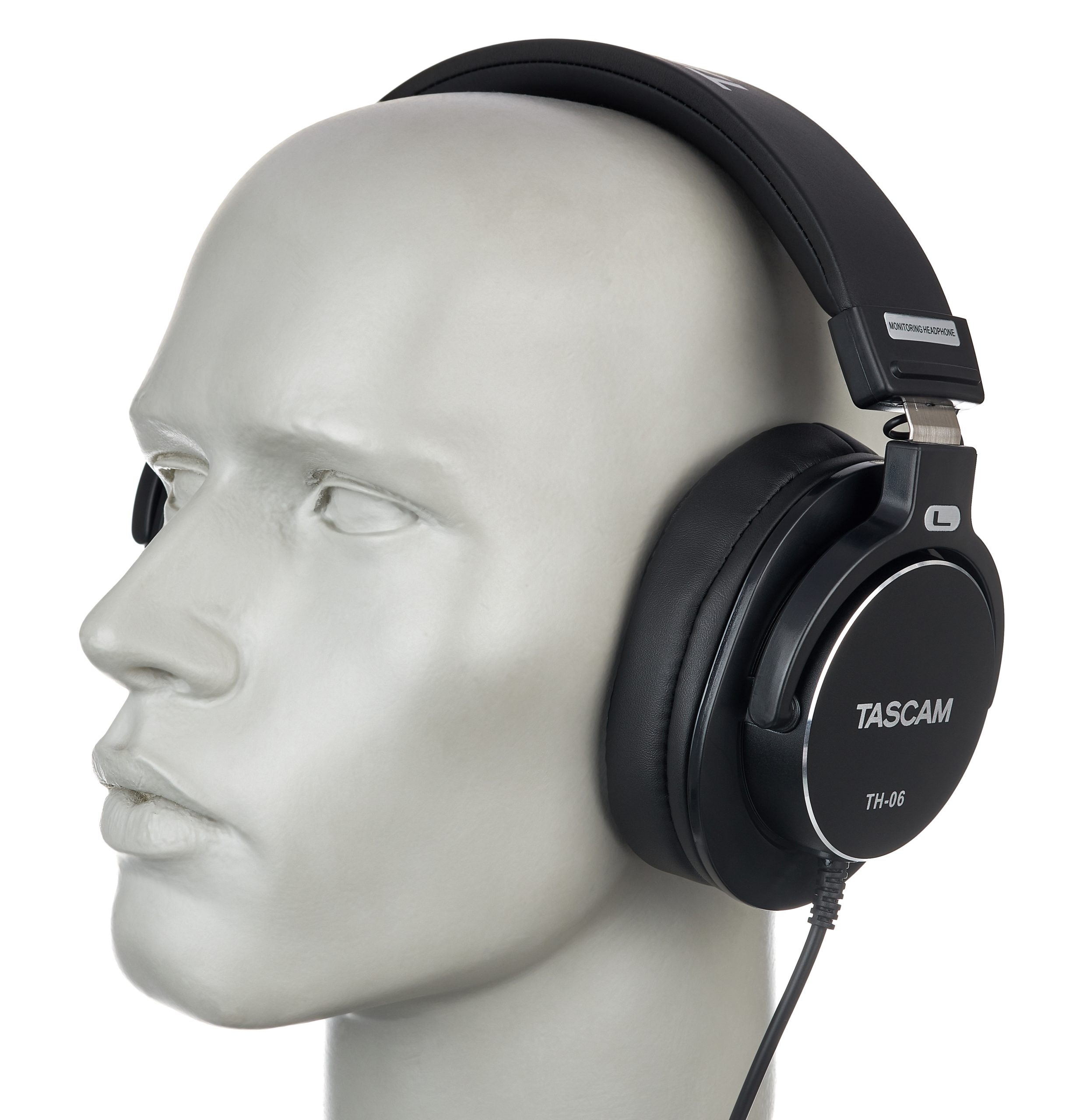 Der martialische Auftritt des Tascam TH-06 täuscht, denn mit einem Gewicht von kaum mehr als 250 g (ohne Kabel) ist er ein wirklich leichter Zeitgenosse. Seine Haptik ist für einen günstigen Kopfhörer durchaus wertig und sein Sitz angenehm. Die Größenverstellung des Kopfbandes geschieht stufenlos, ist aber einmal gewählt verstellfrei. Der Anpressdruck des Kopfbügels ist relativ seicht und doch sitzt er sicher. Das ist möglich, weil der Kopfhörer so leicht ist. Aber auch weil die Ohren unter den weichen Polstern nicht ins Schwitzen kommen, eignet sich der TH-06 zum Tragen, wenn es mal wieder etwas länger dauert.
