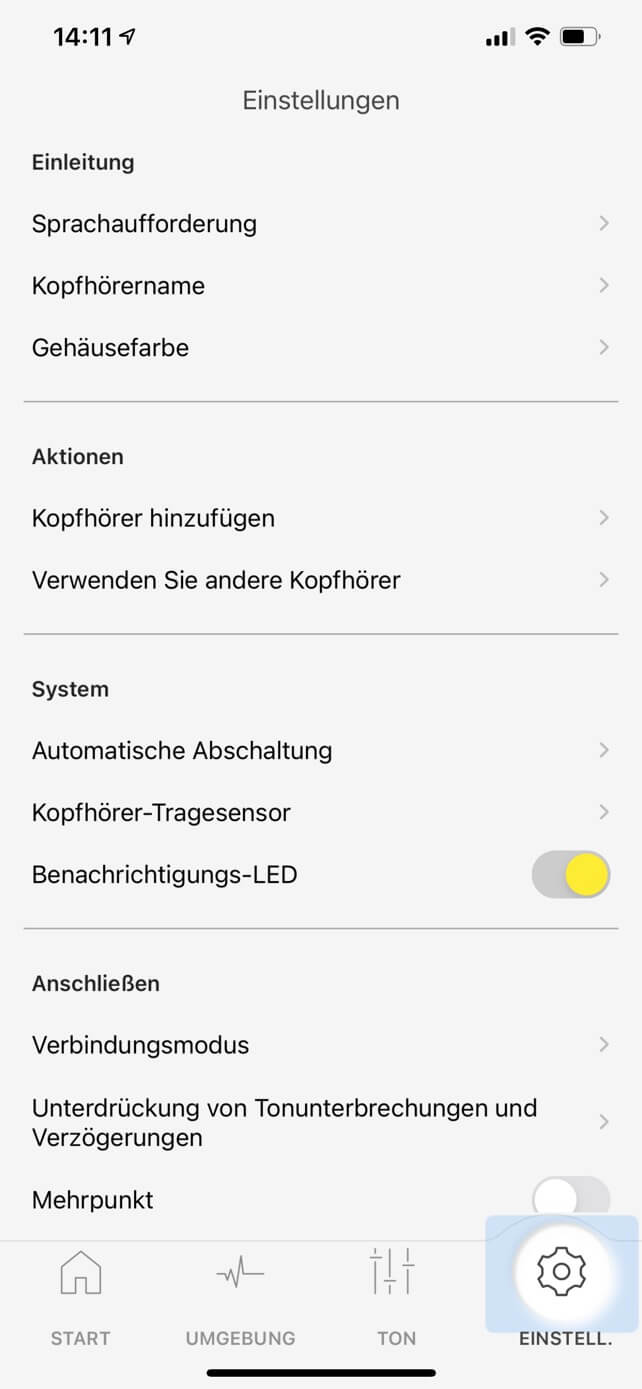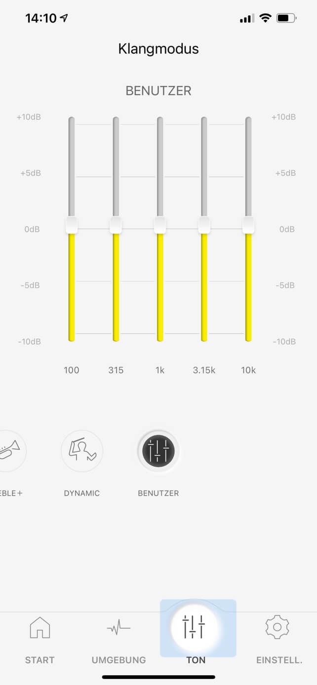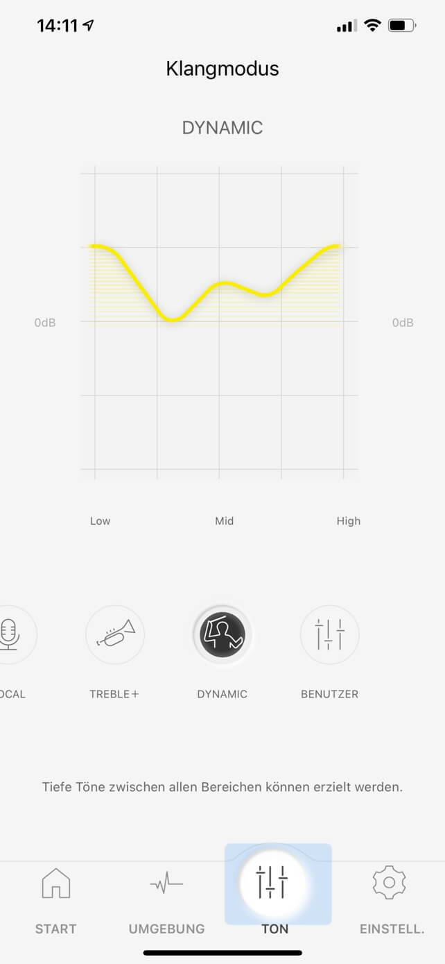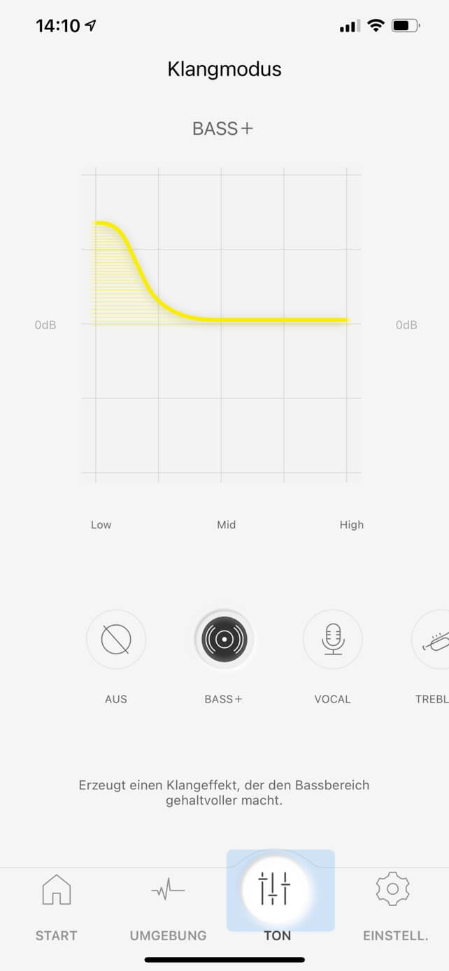 Dieses Klangverhalten bestätigt sich auch im kabellosen Betrieb. Ebenfalls hätte ich mir eine Nuance mehr Bass gewünscht, die selbst die App mit ihrem Klangmodi „Bass+“ und individuell angehobenen 100 Hertz im EQ nicht deutlich kompensiert.
