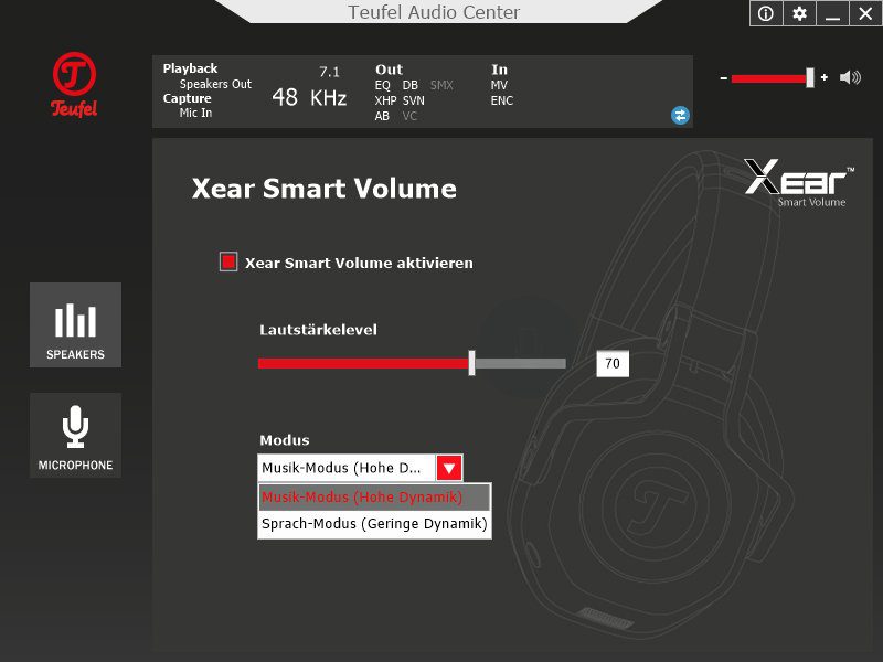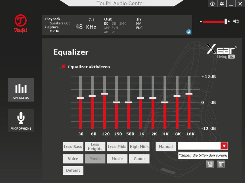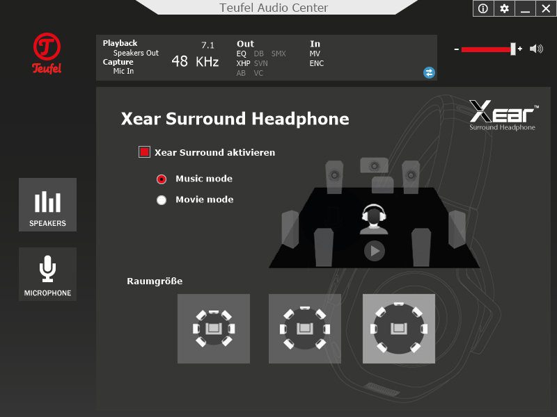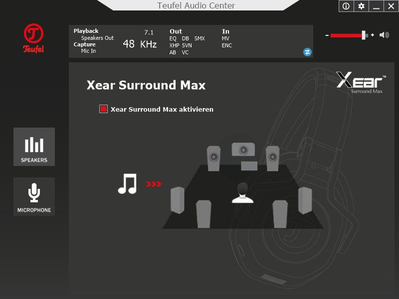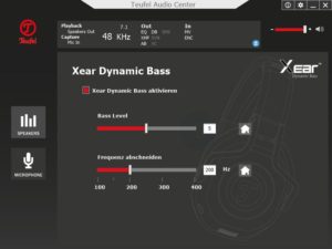 Der ab Werk sehr gute Klang, egal ob beim Gaming oder bei der Musikwiedergabe, kann per Software individuell angepasst werden. Dazu wird das Teufel Audio Center (TAC) benötigt, welches mit Treibern für Windows Vista bis zum aktuellen Windows 10 von Teufel bereitgestellt wird. Neben der Lautstärke (siehe Screenshot 1) lässt sich hier ein Equalizer mit diversen Presets zuschalten. Selbstverständlich lassen sich auch eigene Profile erstellen (siehe Screenshot 2). Im Menü „Xear Surround Sound“ aktiviert man einen virtuellen 7.1 Surround Sound. Neben den beiden Modi „Musik“ und „Film“ hat man noch die Wahl zwischen drei Raumgrößen, die den Klang beeinflussen. Ein Audio-Sample, welches die einzelnen Boxenpositionen ansteuert, hilft bei der Auswahl (siehe Screenshot 3). Die Klangverbesserung „Xear Audio Brilliant“ passt die Präzision der Tonwiedergabe an, z.B. bei stark komprimierten Klangquellen (siehe Screenshot 4). Bassliebhaber schalten „Xear Dynamic Bass“ hinzu. Dort kann man gezielt eine Frequenz anheben (siehe Screenshot 5). Wer Schwankungen in der Lautstärke vermeiden möchte, findet dazu die Funktion „Xear Smart Volume“ (siehe Screenshot 6). Wenn es im Teamspeak rauscht, lässt sich dem im Menü „Xear Voice Clarity“ entgegenwirken, durch Erhöhung des Voice Clarity Levels und der Rauschunterdrückung (siehe Screenshot 7). Die Einstellungen des Klangs komplettiert „Xear Surround Max“. Hier lassen sich Stereo-Signale in ein virtuelles 7.1 umrechnen. Wer es mag, kann also seiner Musik einen räumlicheren Klang verpassen (siehe Screenshot 8). Ebenfalls per TAC konfigurierbar ist die Abtastrate des Kopfhörers, von 44,1 bis 96KHz und in 16 oder 24 Bit.