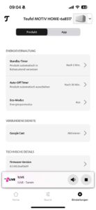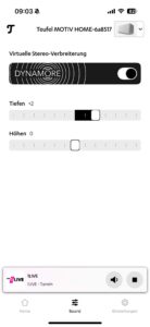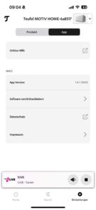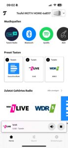Die App „Teufel Home“ erweist sich bei genauerer Betrachtung als ein mächtiges Werkzeug, um alle Möglichkeiten der Motiv Home bequem vom Handy aus zu steuern. Zunächst einmal kann man die Musikquellen direkt schalten. TuneIn bleibt sogar innerhalb der App. Man kann dabei durch sehr viele Radiosender, sortiert nach Interesse, navigieren und drei Favoriten speichern, im Bluetooth-Menü seine gespeicherten Geräte ansteuern sowie umschalten und die Spotify- oder Tidal-App aufrufen.