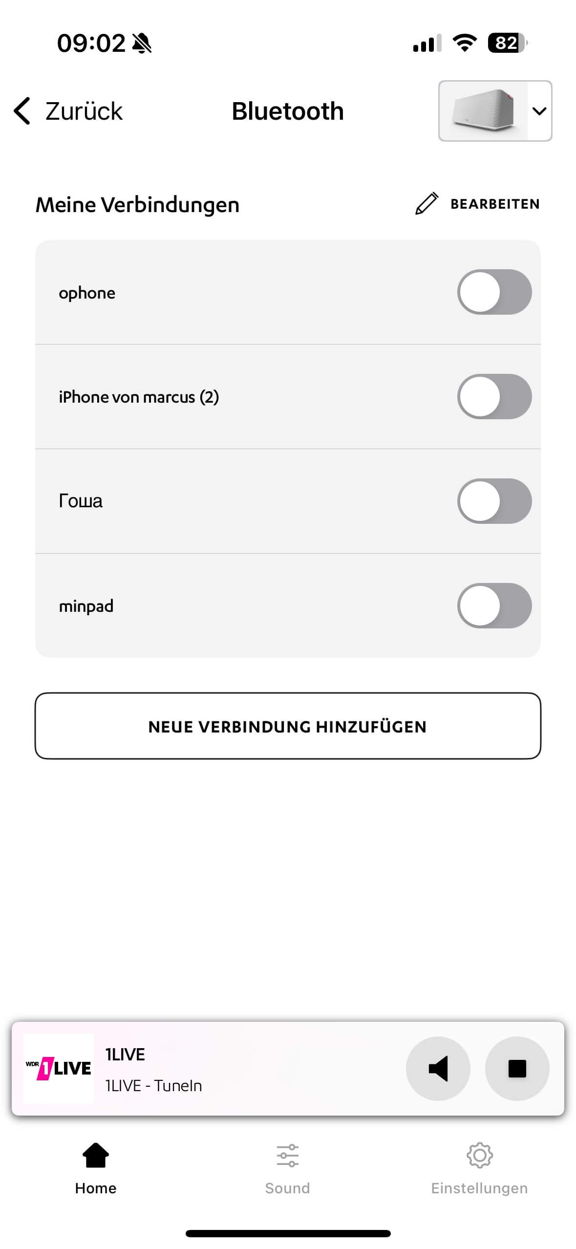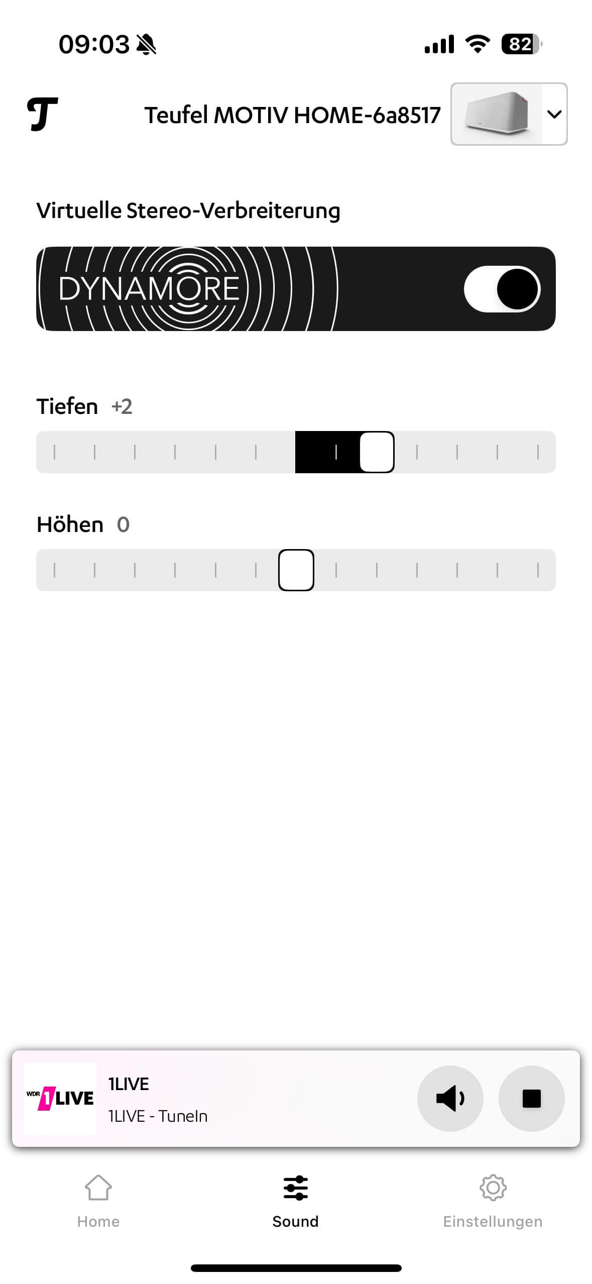 Durch Tippen auf das Lautsprecher-Pikto oben rechts in der App lässt sich dann auch noch der Akku-Stand anzeigen. Vieles davon kann man aber auch direkt an der Box regeln. Lautstärke, Start/Stop über das zentrale Drehrad, Quellenauswahl und Skip vor/zurück auf der linken Seite. Rechts lassen sich die drei Favoriten von TuneIn direkt über „1, 2, 3“ aufrufen – was aber dazu führt, dass ich an der Box nirgends mehr zu Apple Music zurückfinde. Schließlich kann noch der Bass-Pegel im Zusammenspiel mit dem Drehregler justiert und Dynamore geschaltet werden.