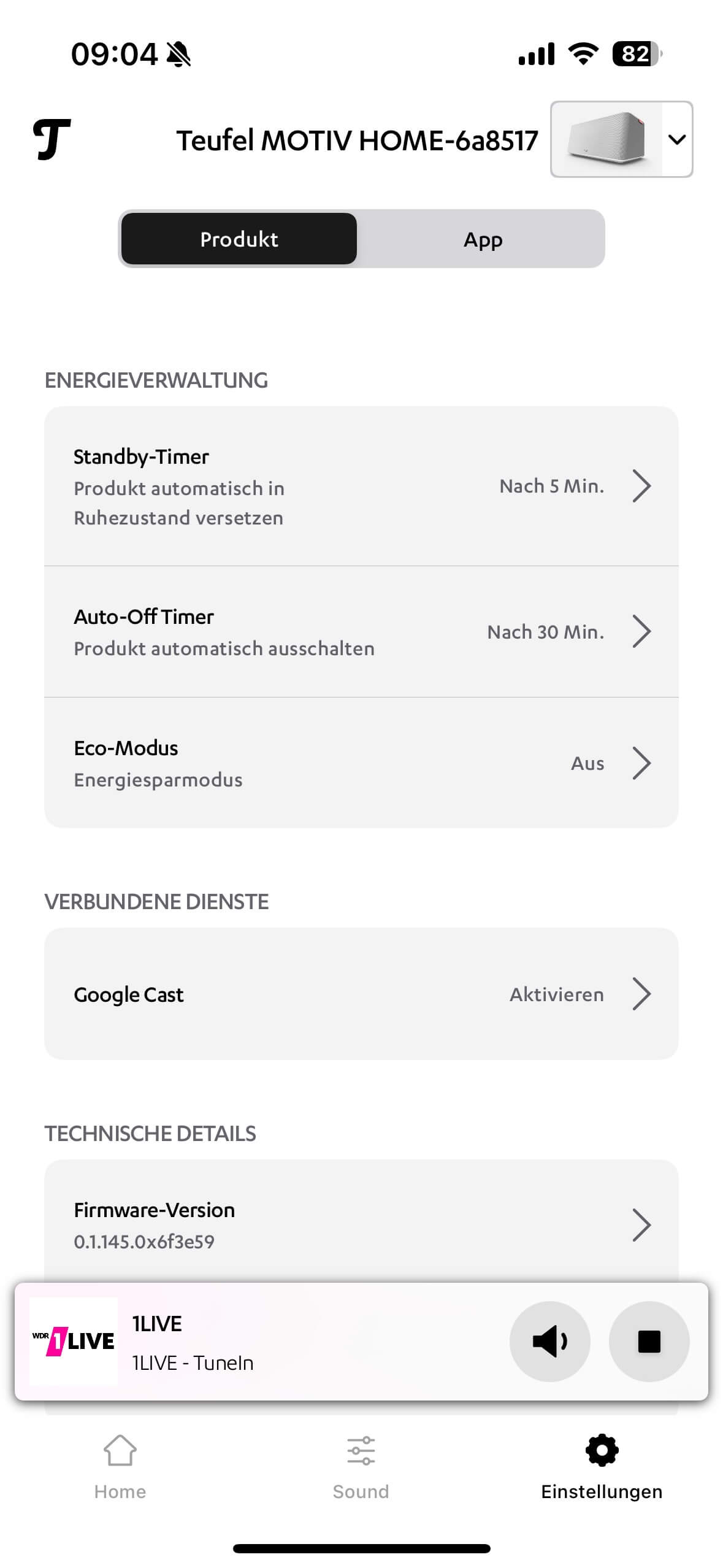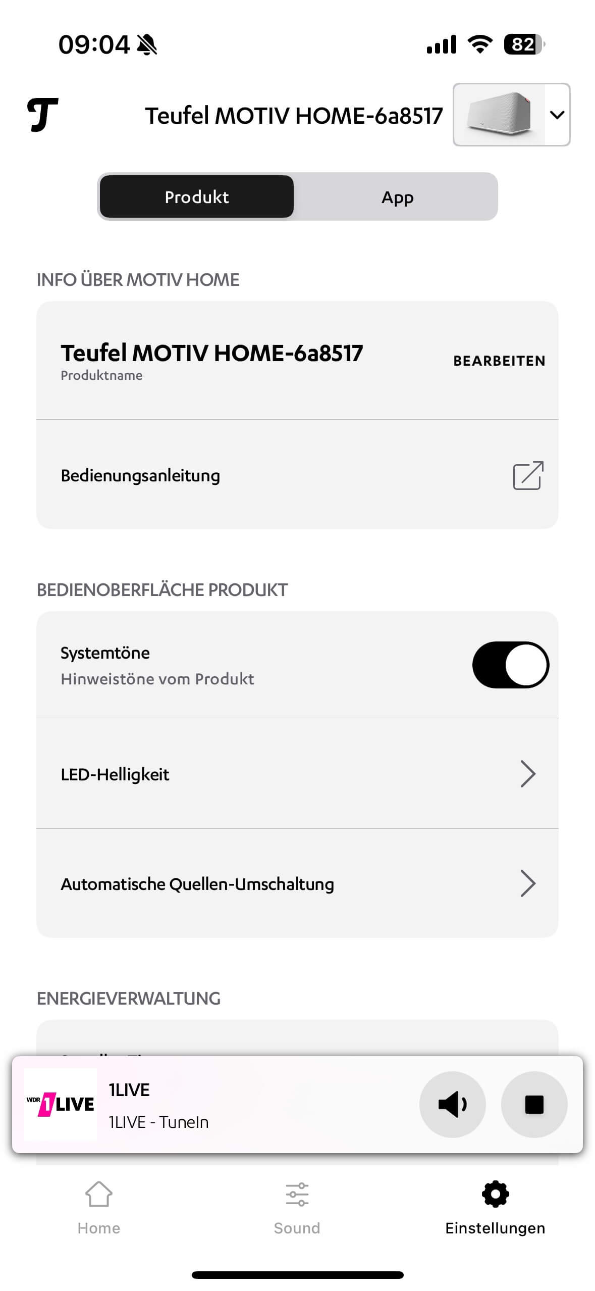 Im Menü „Sound“ gibt es zwei Regler für Bass und Höhen sowie die Möglichkeit, das Feature „Dynamore“ zu schalten, was eine virtuelle Stereo-Verbreiterung aktiviert. Alle Schieberegler-Aktionen quittiert die Box immer mit anteiligem Aufleuchten der LED-Kette. Deren Helligkeit kann man im Einstellungen-Menü dann auch, nun ja, einstellen oder über einen Sensor automatisiert dimmen lassen. Beim Punkt „Energieverwaltung“ können diverse Timer und ein Eco-Modus eingestellt werden, weiter unten wird die Firmware abgefragt und nach Updates geschaut und viele Kleinigkeiten mehr.