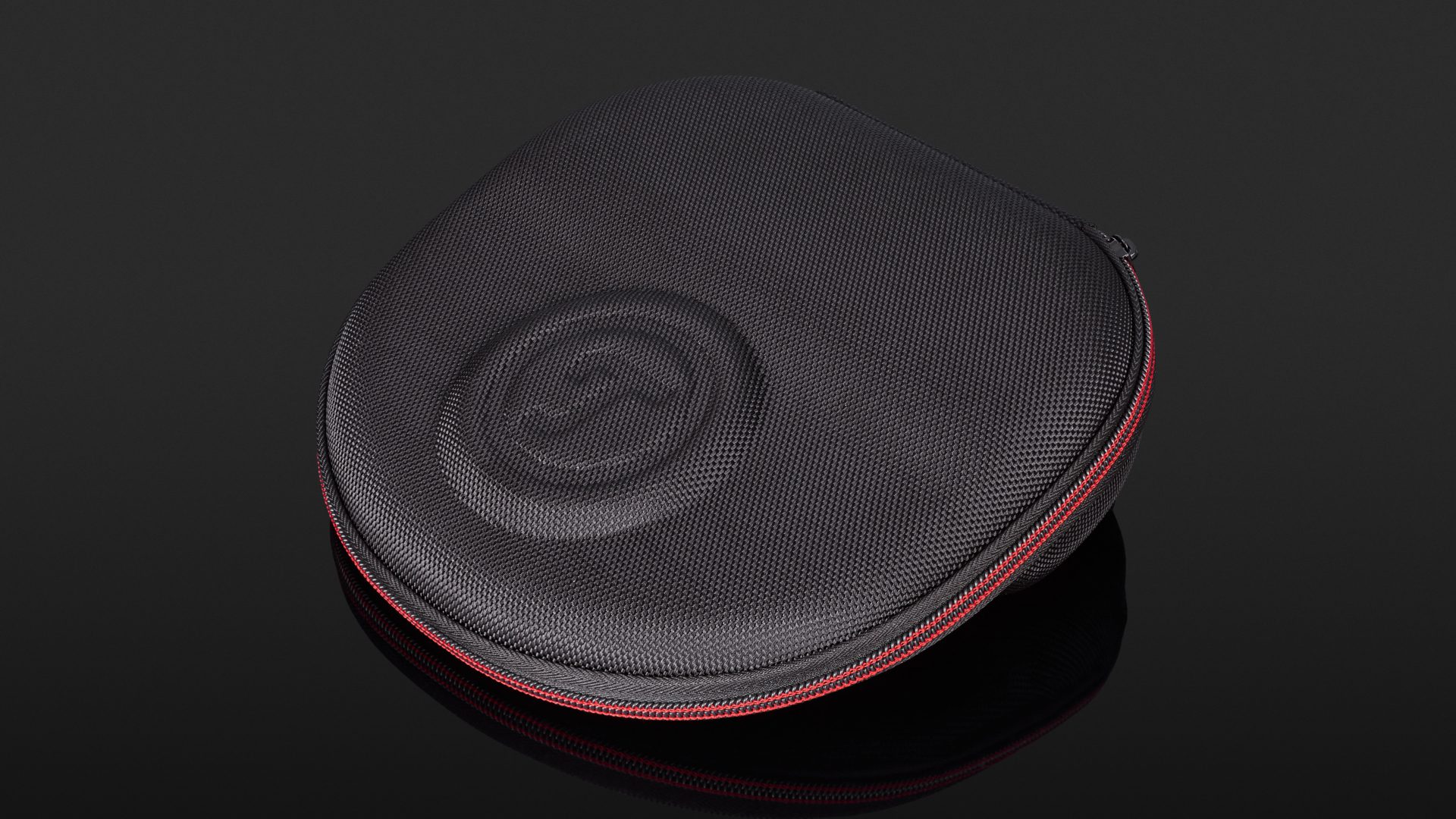 Die Verpackung macht etwas her. Hier beweist Teufel schonmal Geschmack: Eine schwarz/rote Kartonage wird nach oben aufgeklappt und gibt ein schlankes und stabiles Transport-Case frei. Zippen, öffnen, freuen – der Inhalt besteht aus dem Mute Hörer und einem per Klettverschluss „angepapptes“ Neopren-Säckchen, das dem stoffummantelten Miniklinkenkabel, dem Flugzeugadapter und der unverzichtbaren AAA-Batterie ein schnuckelig warmes Zuhause bietet.