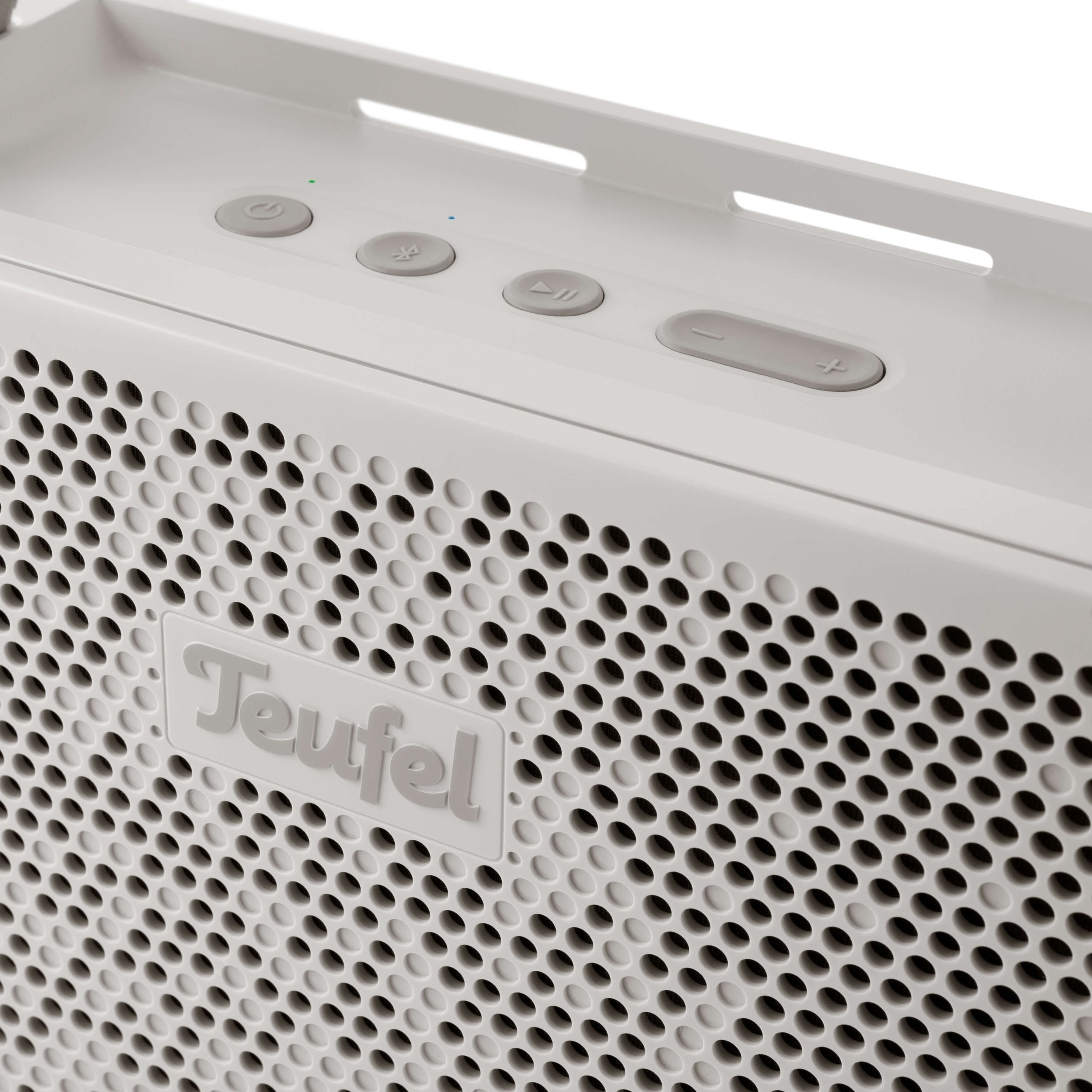 Die Bedienelemente am Teufel Mynd befinden sich auf der Oberseite und sind auf das Nötigste reduziert. Neben dem Ein-/Einschalter ist die Bluetooth-Taste zu finden. Mit ihr kann man die drahtlose Übertragung de-/aktivieren und auch die Kopplung mit neuen Geräten starten. Rechts davon sind die Play/Pause-Taste sowie die Leiser-/Lautertasten, die die typischen Funktionen ausführen.