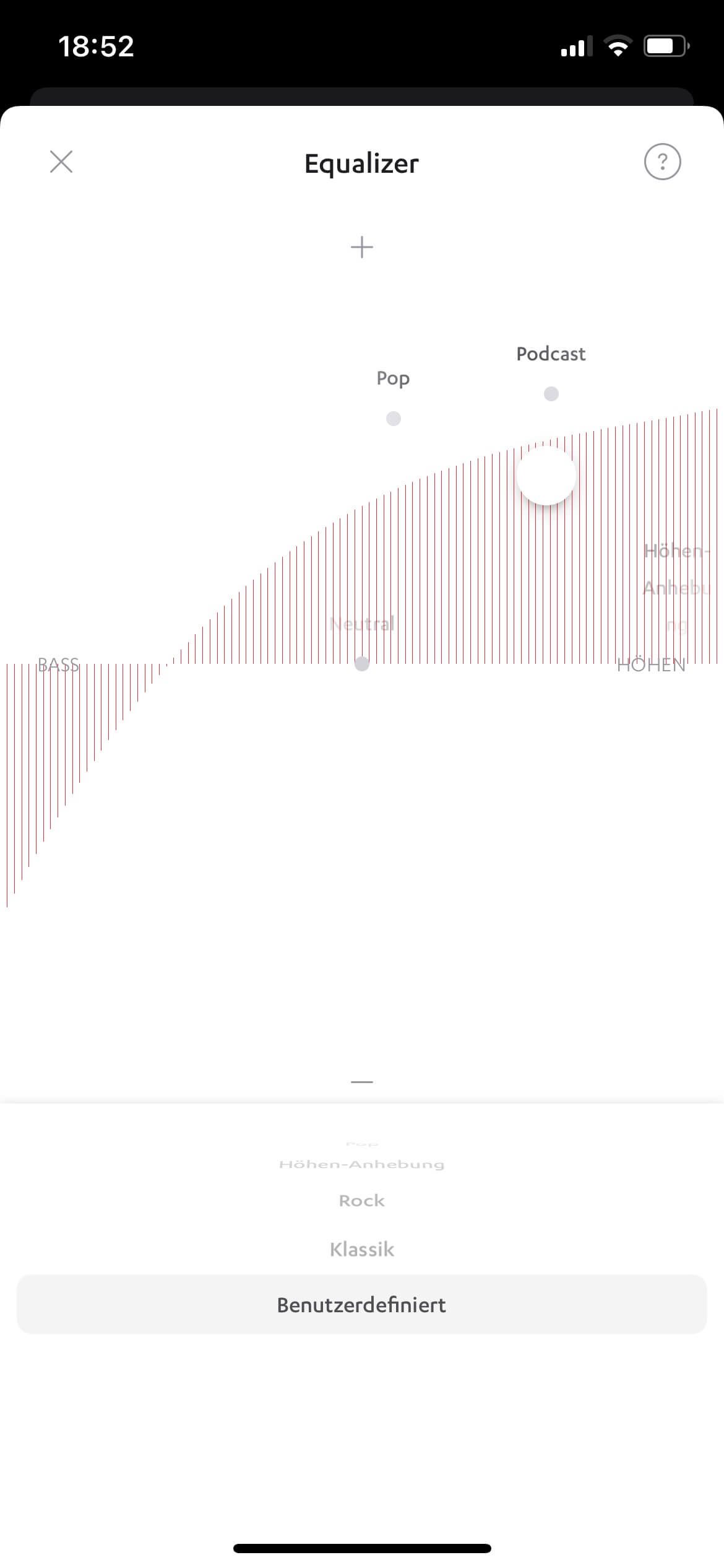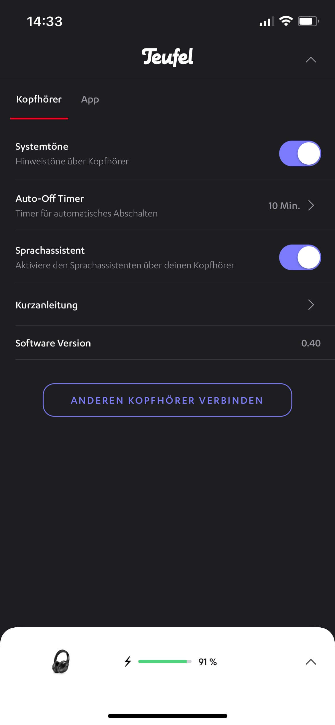 Empfehlenswert ist die Installation der Teufel Headphones App (iOS und Android), in der unter anderem ein Equalizer zur Verfügung steht und mit einer „Share Me“ genannten Funktion das Programm auf einen weiteren (kompatiblen) Teufel-Kopfhörer gesendet werden kann.