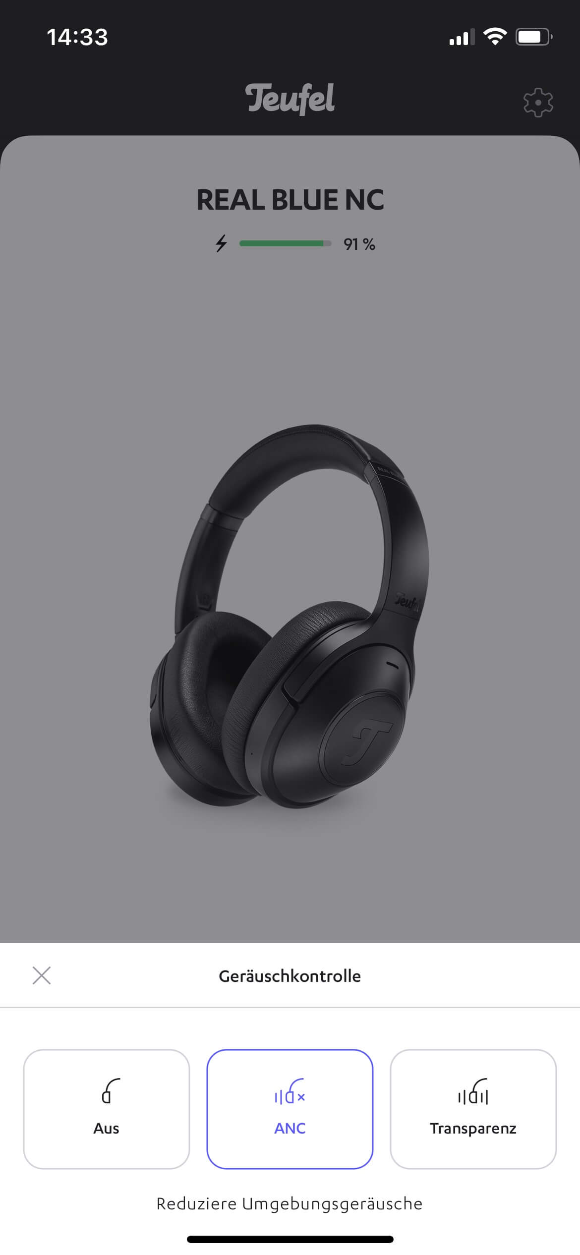 Da die Real Blue NC dicht auf den Ohren sitzen, werden Außengeräusche recht ordentlich abgeschirmt. Was dann noch störend in das Hörprogramm einwirkt, möchte die aktive Geräuschunterdrückung mit gegenphasiger Bearbeitung auslöschen. Das gelingt ihr auch ganz gut, wenn auch nicht überragend. Schaltet man das ANC ein, erhöht sich zunächst einmal der Rauschpegel ein wenig. Was dann erfolgt, ist die weitestgehende Auslöschung der tieferen Frequenzen, so dass bei meiner Dunstabzugshaube nur noch ein mittelhelles Sirren zurückbleibt. Der abfahrende Bus ist präsent, aber er wirkt nicht mehr so schwer und groß, wenn nur noch die mittleren und hohen Anteile ans Ohr gelangen. Einen ausgeprägten und manchmal unangenehmen Taucherglockeneffekt kann ich im Betrieb nicht feststellen. Insgesamt ist das ANC in Kombination mit der mechanischen Abschottung gut und brauchbar, aber andere können das besser.