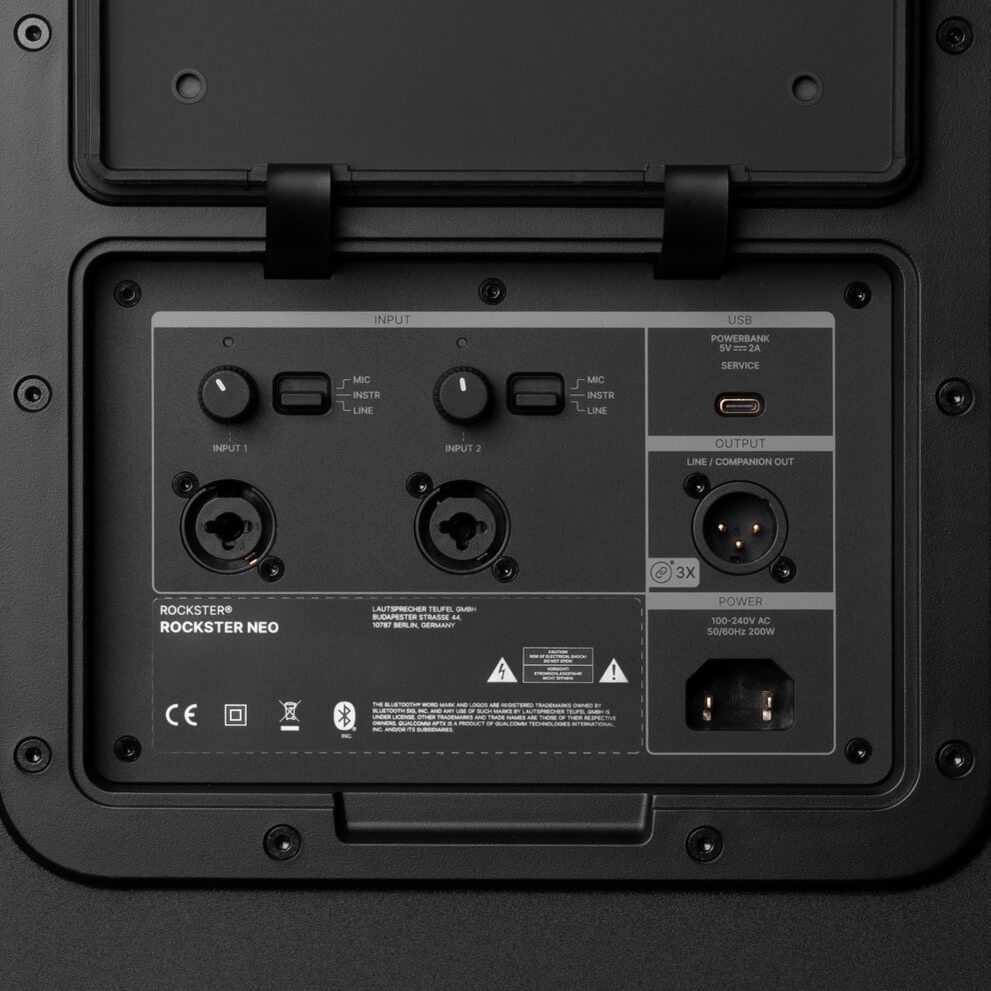 Die Bedienelemente des Teufel Rockster Neo sind übersichtlich angeordnet und ermöglichen auch im Partytrubel eine schnelle Steuerung. Die wichtigsten Funktionen wie Lautstärke, Klangmodus oder Eingangswahl lassen sich direkt am Gerät regeln. Zusätzlich ist eine App angekündigt, die ab Juli 2025 erweitertes Klang-Tuning per Smartphone erlaubt.