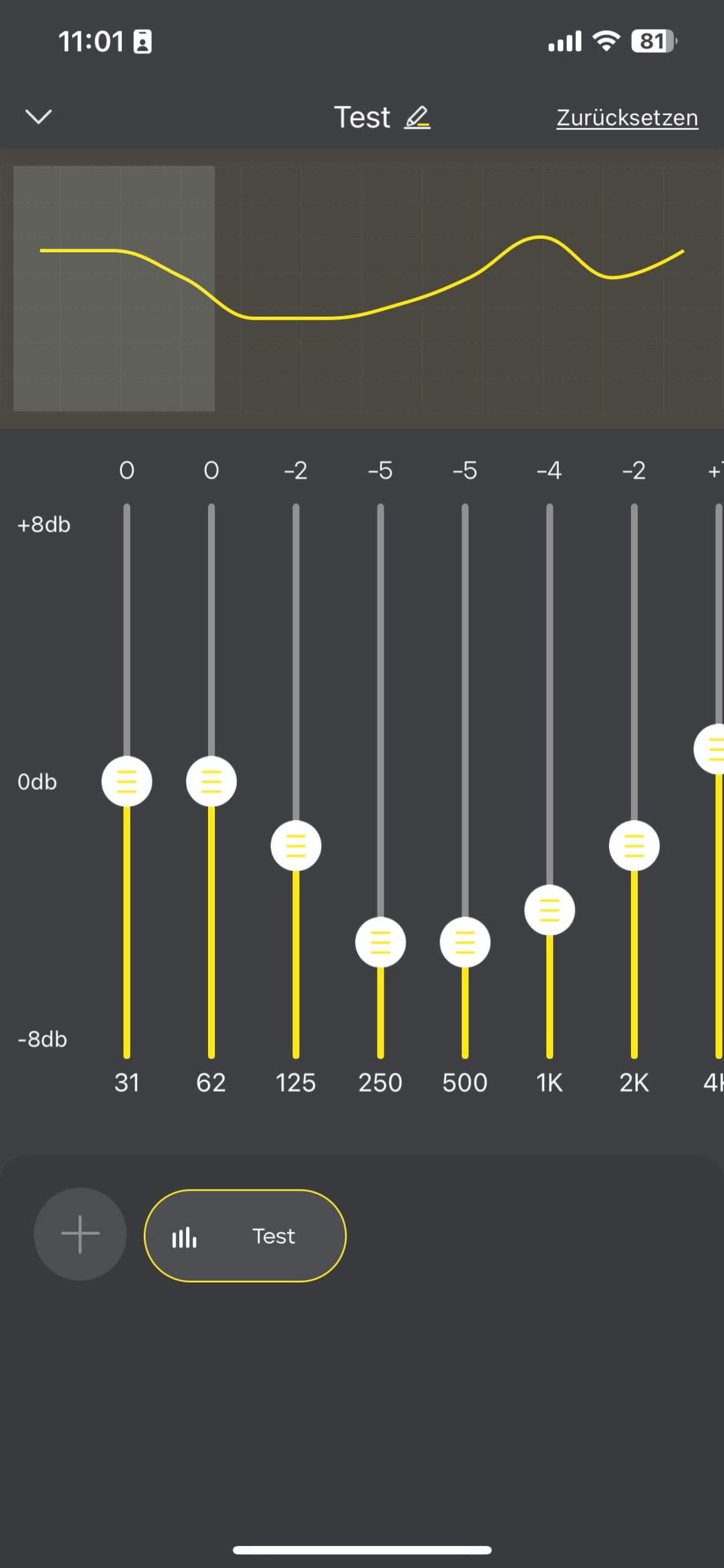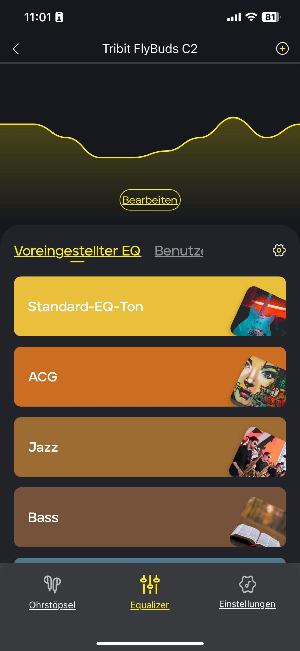 Mit 25 Sound-Presets dürfte das Klangbild auf jeden Fall den individuellen Hörgewohnheiten entsprechen. Die Einstellungsoptionen sind klassifiziert nach „Jazz“, „Heavy Metal“, „Tanz“, „Ballade“, „Rock“, „Rap“, „Elektronisch“, „Klassisch“ und „Blues“, können aber auch nach Klangpräferenzen (weicher oder starker Bass) eingestellt werden. Selbst für Podcasts oder „Vorlesen“ hält die App die passende Einstellung. Wem die Presets nicht zusagen, der tobt sich an den Frequenzreglern des 10-Band-EQs aus. Eine Klanganpassung, die meines Erachtens die Hörer gar nicht nötig haben.